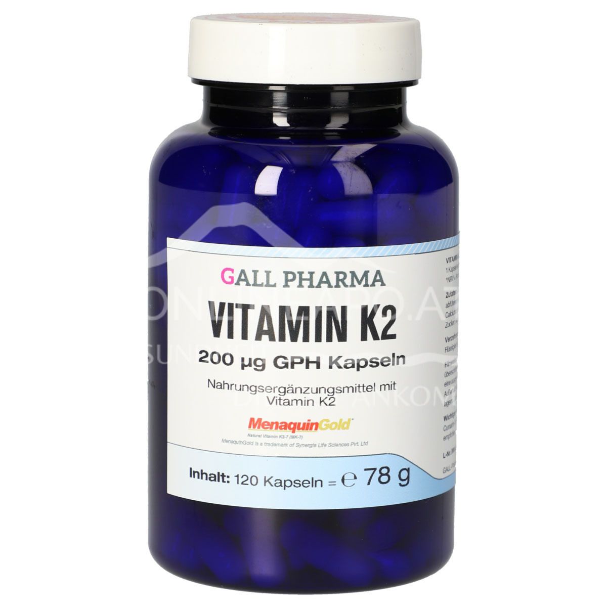 Gall Pharma Vitamin K2 200 mcg capsules are a food supplement containing vitamin K2. Vitamin K2 contributes to normal blood clotting and the maintenance of normal bones.