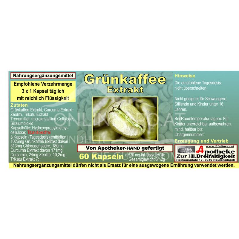 - Ingredients: Green coffee extract, curcuma extract, zeolite, trikatu extract, anti-caking agent: microcrystalline cellulose, silicon dioxide, capsule shell: hydroxypropylmethylcellulose.