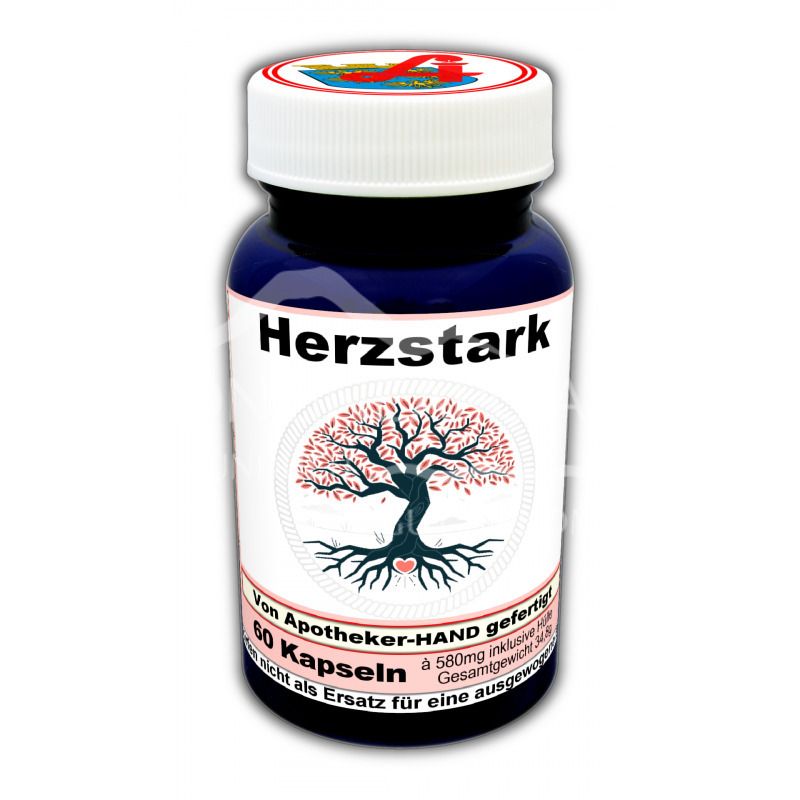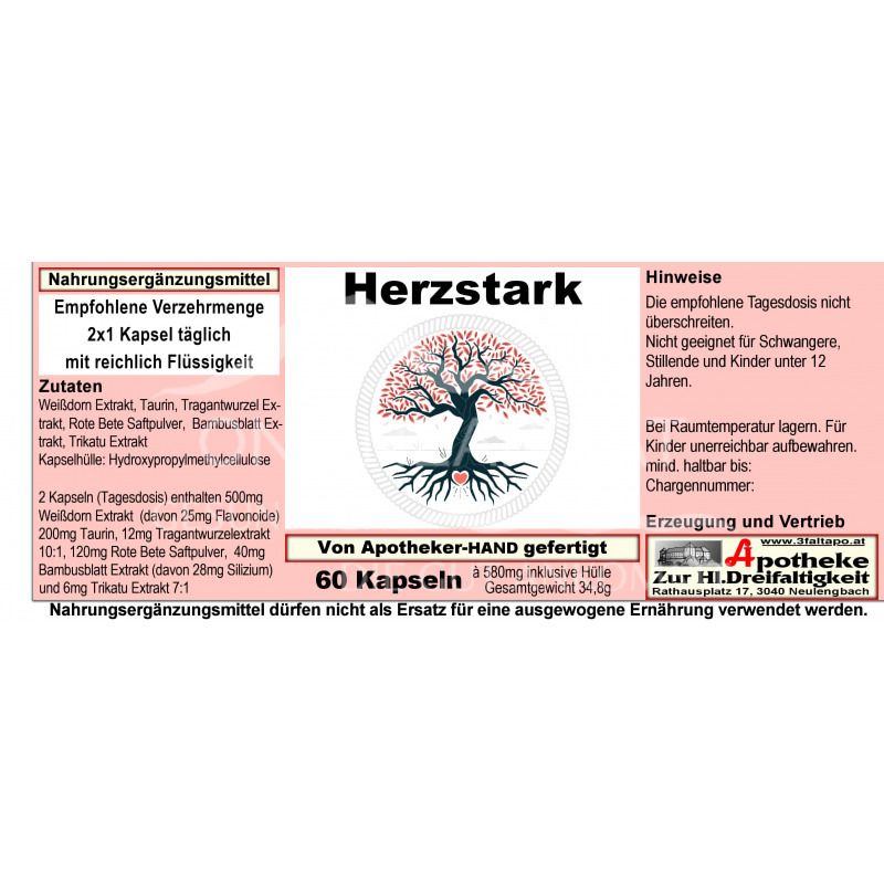 The Herzstark capsules are a dietary supplement with a sophisticated combination of herbal ingredients such as hawthorn extract, tragacanth root extract, beetroot juice powder, bamboo leaf extract and additionally supplemented with taurine.