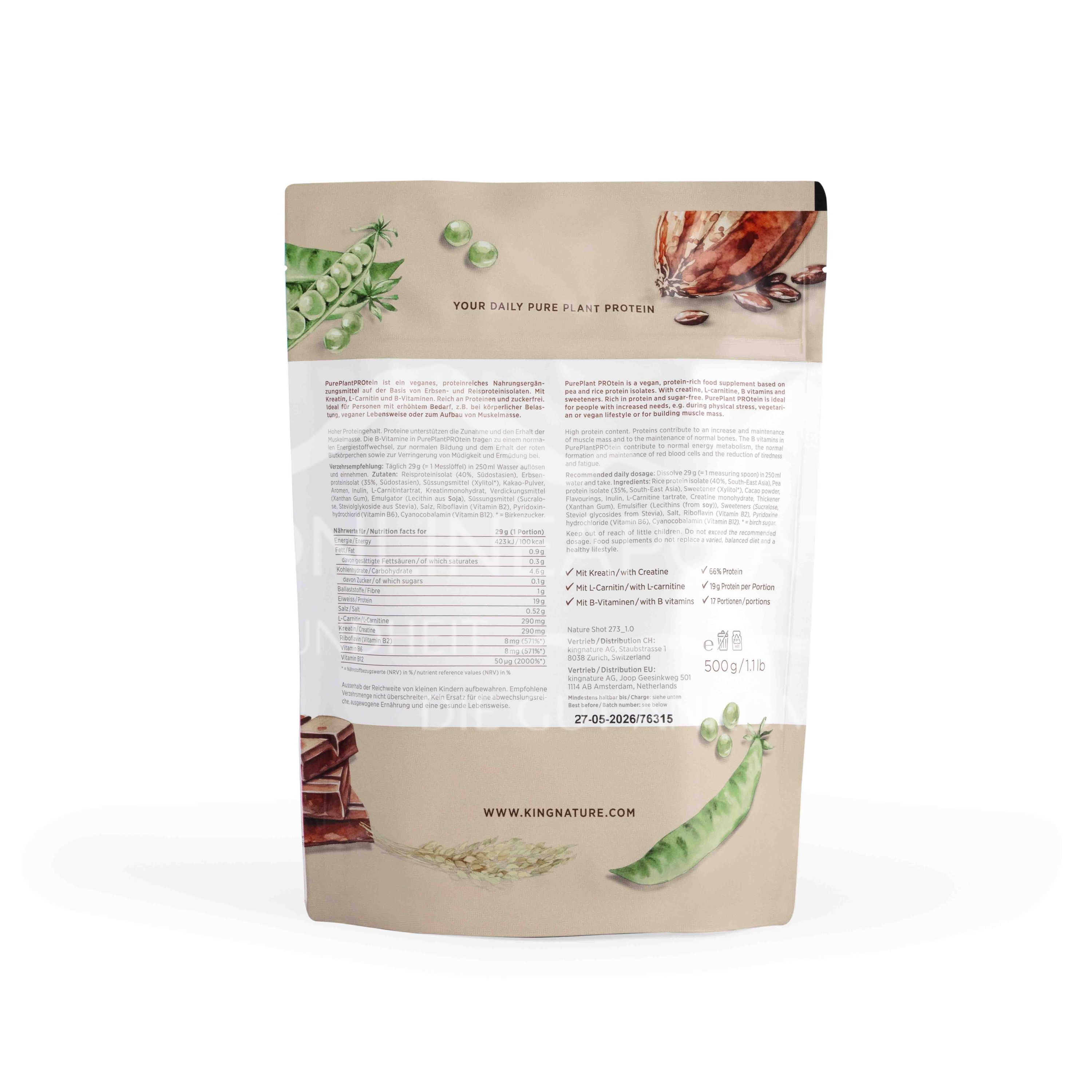 Kingnature PurePlantPROtein Chocolate is a vegan protein powder based on rice and pea protein isolate. With creatine, L-carnitine and B vitamins. Rich in protein, low in fat and sugar-free. For physically active men and women.