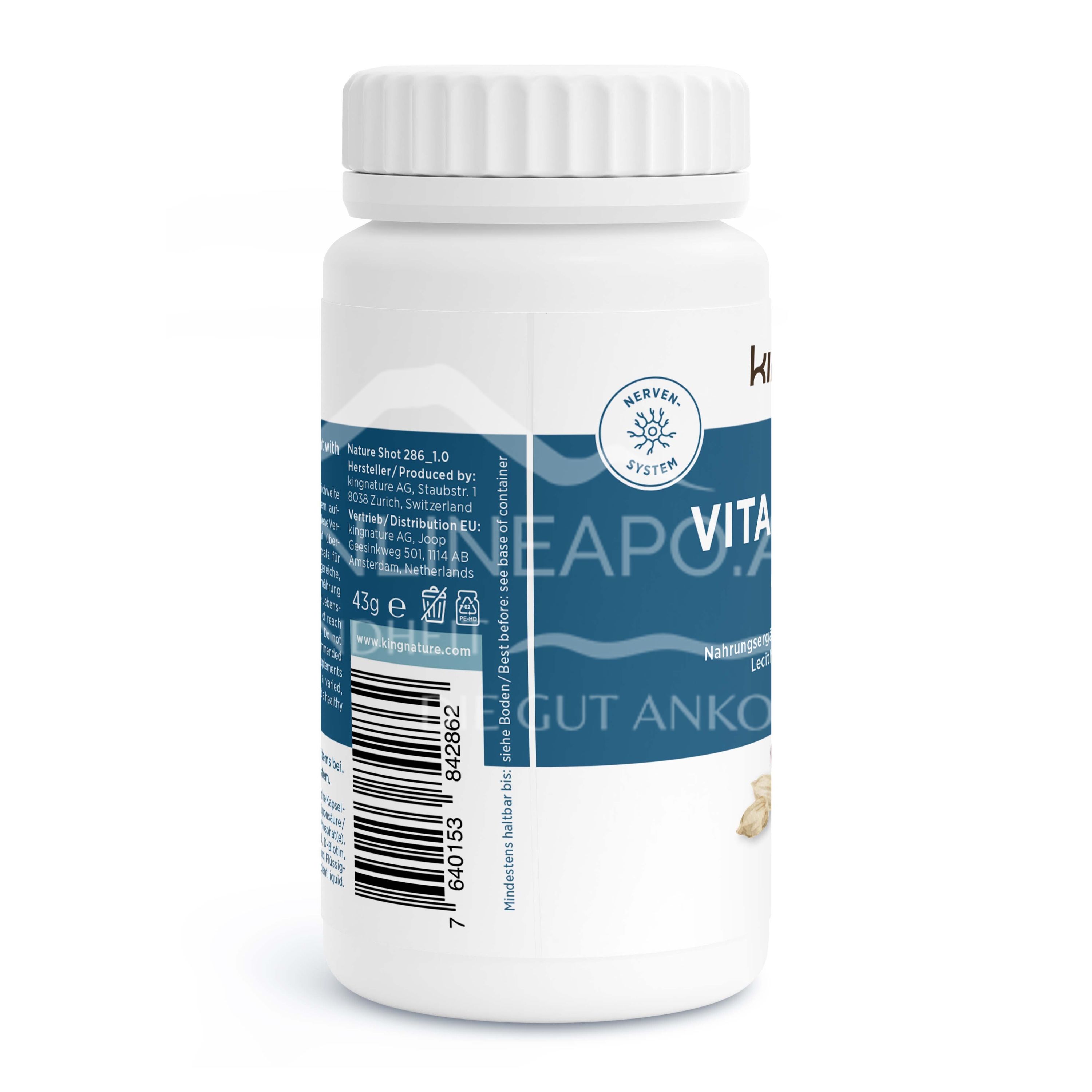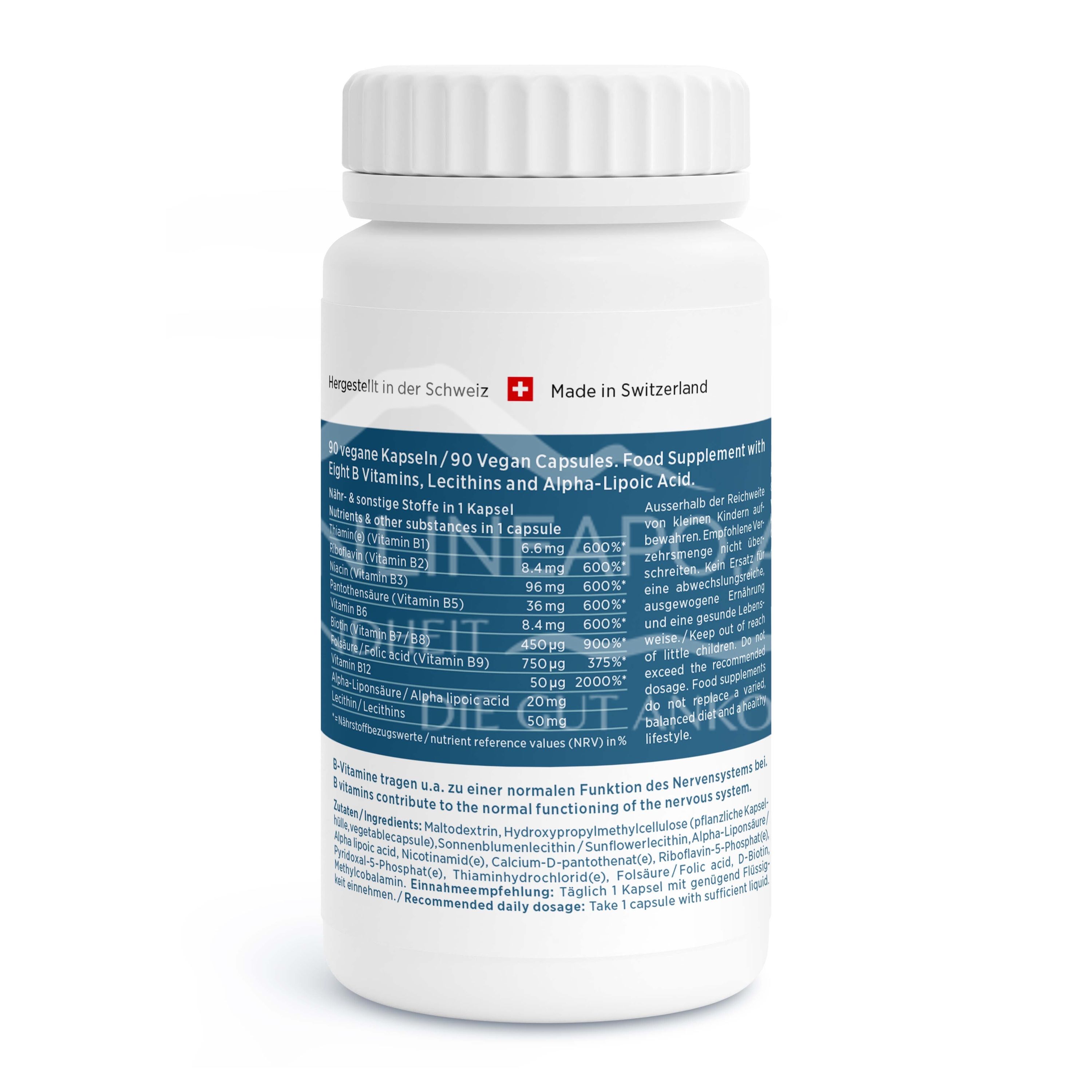 - Zusammensetzung pro Tagesdosis (1 Kapsel) %NRV*: Thiamin (Vitamin B1) 6.6 mg 600%*, Riboflavin (Vitamin B2) 8.4 mg 600%*, Niacin (Vitamin B3) 96 mg 600%*, Pantothensäure (Vitamin B5) 36 mg 600%*, Vitamin B6 8.4 mg 600%*, Biotin (Vitamin B7/B8) 450 µg 900%*, Folsäure / (Vitamin B9) 750 µg 375%*, Vitamin B12 50 µg 2000%*, Alpha-Liponsäure 20 mg, Lecithin 50 mg. * NRV = % der Nährstoffbezugswerte.