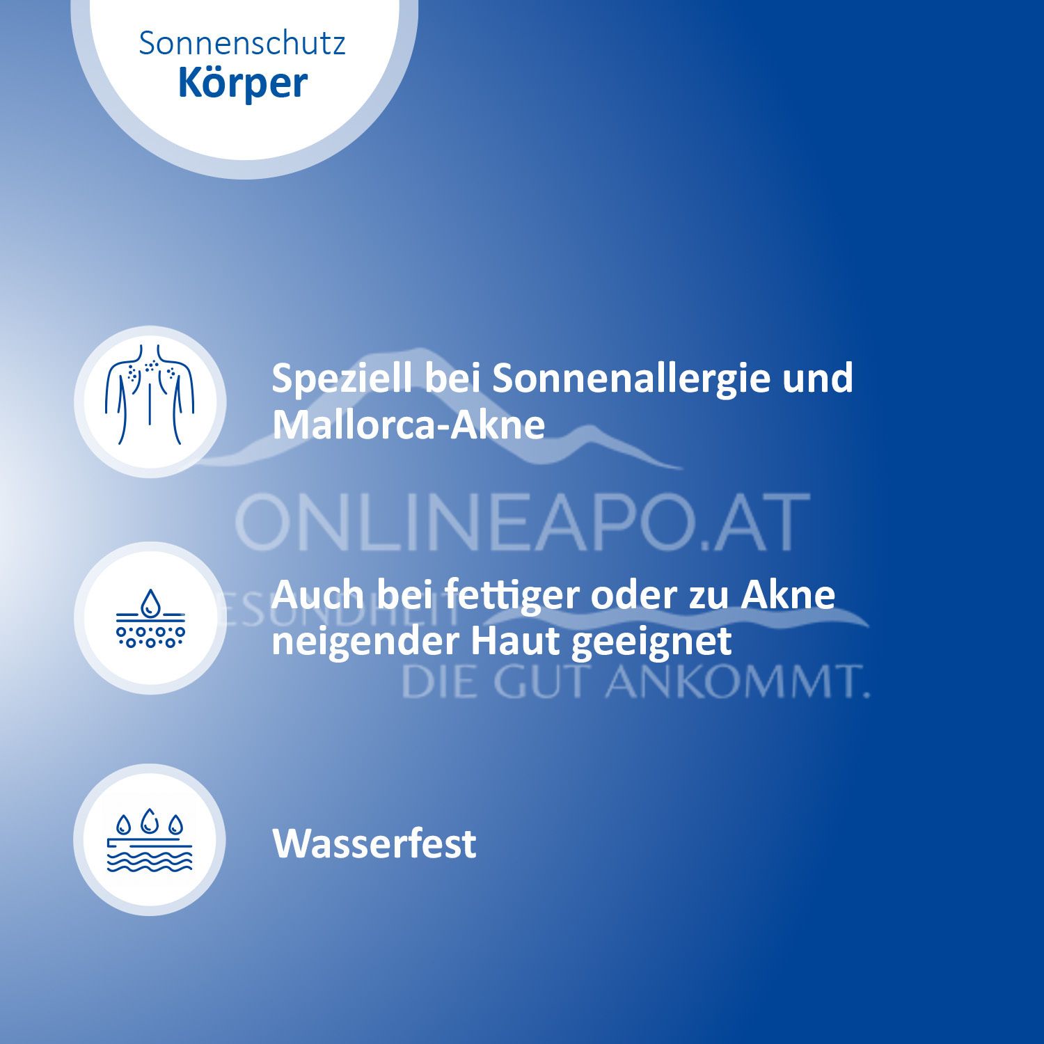 Haut, die zu Irritationen neigt, benötigt nach einem Tag in der Sonne eine spezielle emulgatorfreie Pflege, um allergische Reaktionen beim nächsten Sonnenbad zu vermeiden. Herkömmliche Lotionen enthalten Emulgatoren, die bis zu 24 Stunden in der Haut bleiben. Bei Sonnenallergie und Mallorca-Akne ist deshalb eine Spezial-Pflege wie das Ladival® Allergische Haut Après Pflege-Gel ratsam.