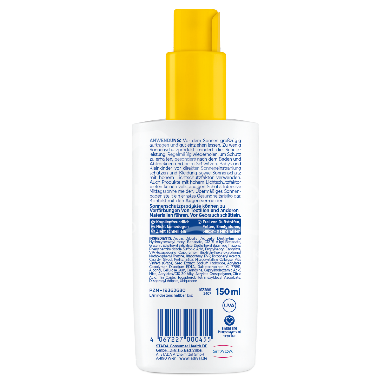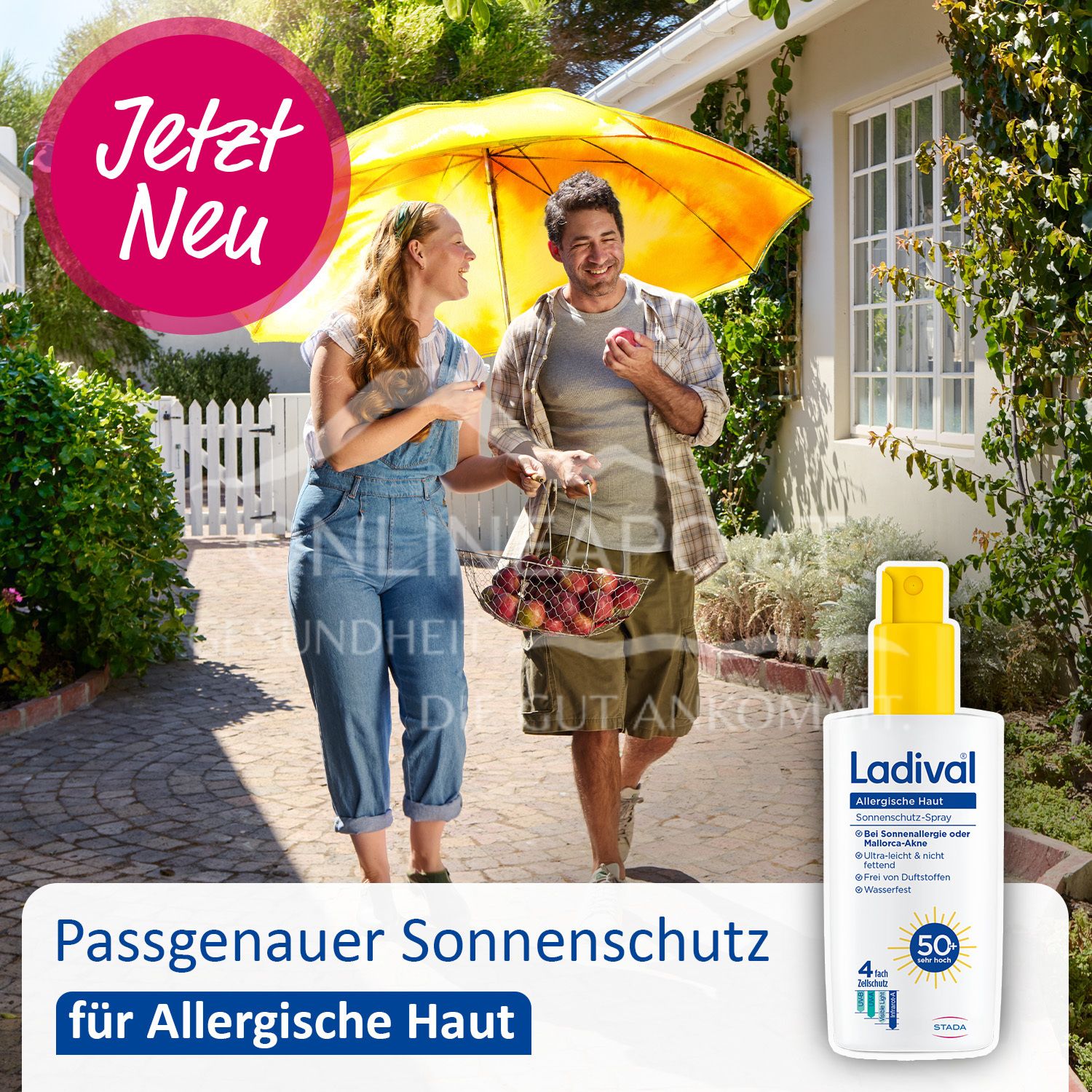 Maximale Sicherheit bei Sonnenallergie und Mallorca-Akne: Das Ladival LSF 50 + Sonnenschutz-Spray bietet 4-fach Zellschutz ohne Fette und Emulgatoren. Die wasserfeste Formel zieht schnell ein und schützt sofort vor UVA/UVB/IR-A.