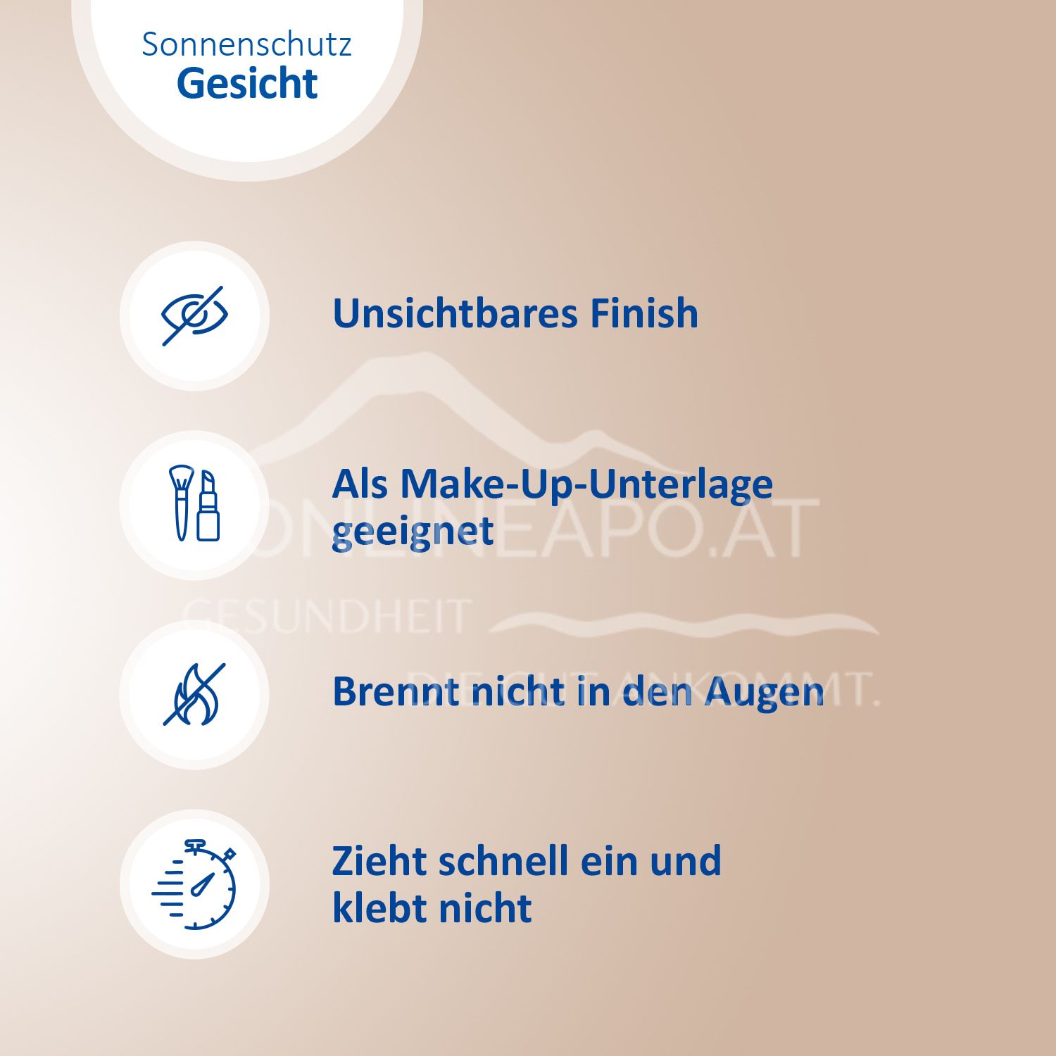 Tragen Sie die Sonnenschutz-Creme großzügig auf das Gesicht, den Hals, das Dekolleté und die Hände auf. Vor dem Auftrag von Make-Up oder anderen Gesichtsprodukten gut einziehen lassen.