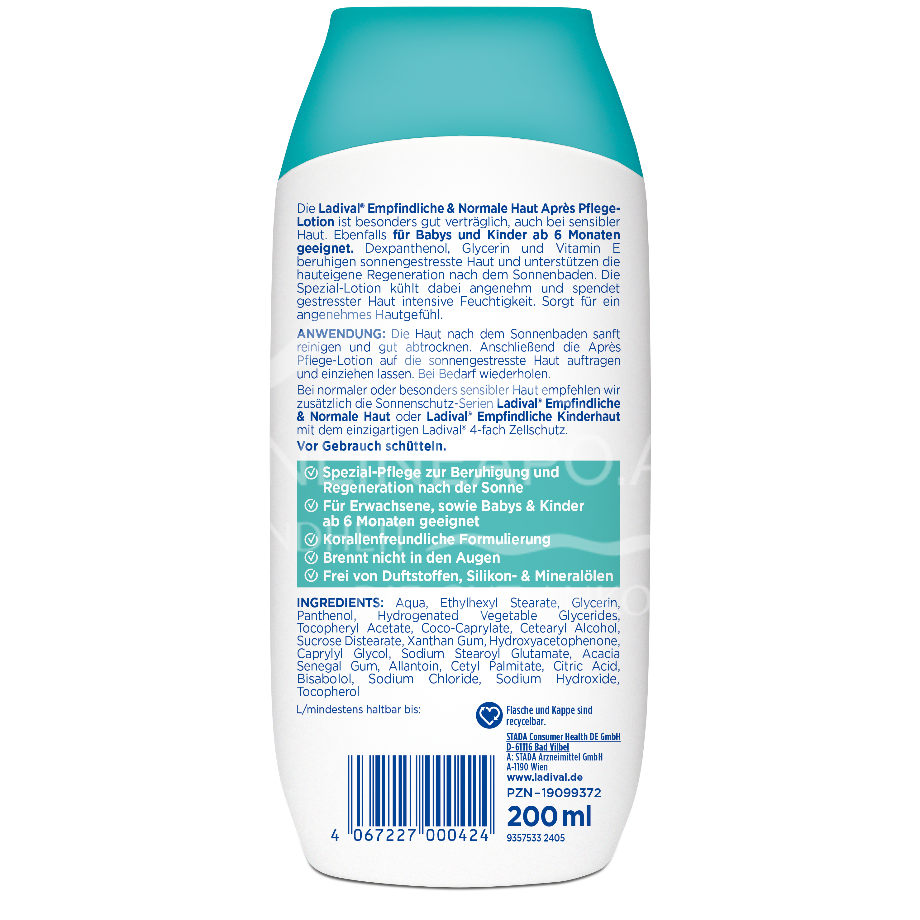Die Ladival® Empfindliche & Normale Haut Après Pflege-Lotion wird nach dem Sonnen als intensive Feuchtigkeitspflege Ihrer Haut angewendet. Es pflegt und regeneriert die Haut mit Panthenol, Glycerin und Vitamin E.