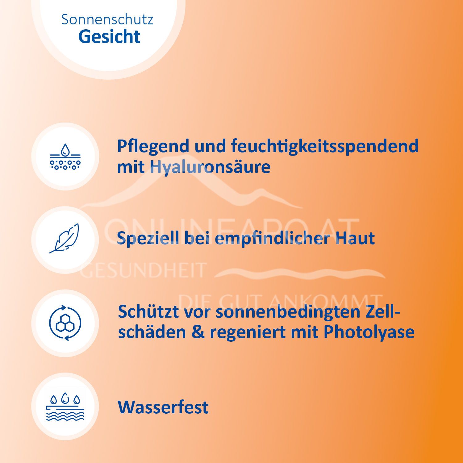 Die reichhaltige Öl-in-Wasser Emulsion pflegt und spendet Feuchtigkeit mit Hyaluronsäure und bietet eine ideale Grundlage für Make-Up. Sie schützt nicht nur effektiv vor sonnenbedingten Zellschäden, sondern unterstützt die Haut auch aktiv bei der Regeneration durch Photolyase. Die leichte Rezeptur legt sich sanft und schützend auf die Haut, ohne Augenreizungen oder Pilling-Effekte (Klumpen des Produktes auf der Haut) oder weiße Rückstände zu hinterlassen – so ist die wasserfeste Lotion der perfekte Begleiter im Alltag.
