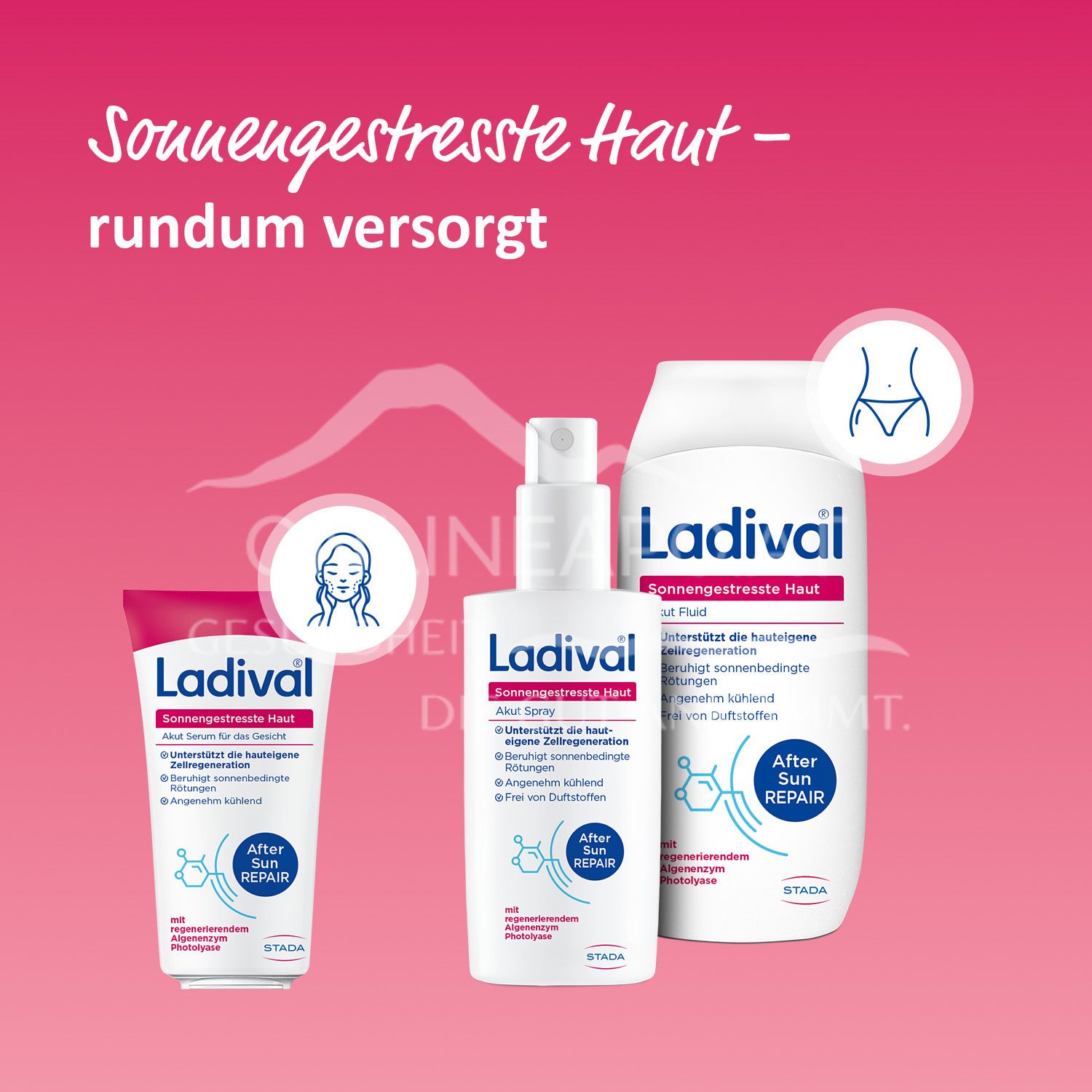 Sollte Ihre Haut von der Sonne gereizt sein und empfindlich reagieren, verschafft die Ladival® Sonnengestresste Haut Akut-Serie schnell Linderung. Diese wurde speziell für UV-gereizte Haut entwickelt und unterstützt die hauteigene Zellregeneration mit dem Algen-Enzym Photolyase.