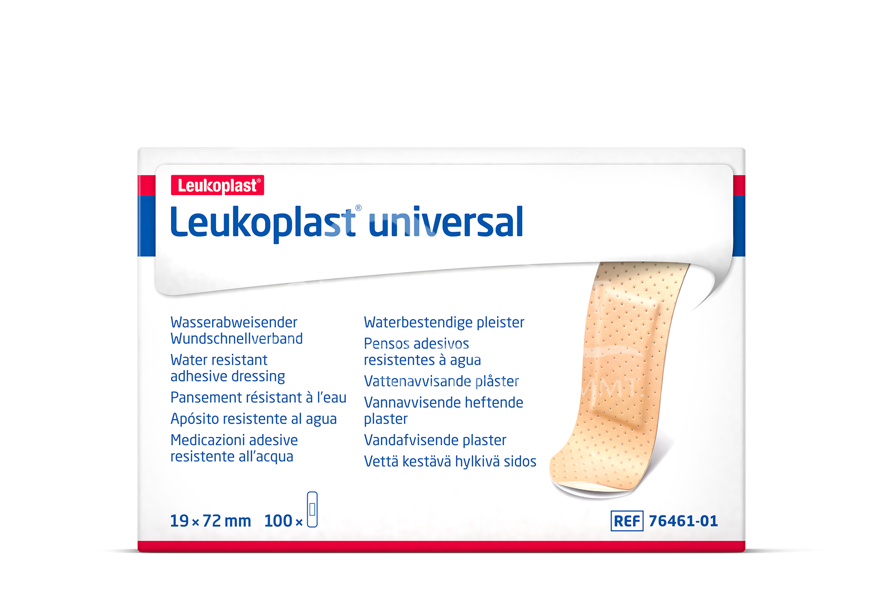 Leukoplast is also the first choice for quick wound dressings. Leukoplast universal is skin-friendly, breathable and water and dirt repellent. Leukoplast universal is ideal for moist and dirty environments. Leukoplast universal consists of a non-woven film laminate with a non-woven wound dressing that does not stick to the wound. Leukoplast universal finger strips are completely latex-free. Leukoplast universal is coated with an acrylate adhesive