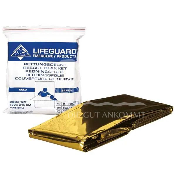 Schützen Sie sich effektiv mit der Lifeguard® Rettungsdecke (160x210 cm) in Gold-Silber. Ideal zum Wärmeerhalt oder zur Kühlung bei Unfällen oder Outdoor-Aktivitäten. Kompakt, leicht & unverzichtbar für Erste-Hilfe-Ausrüstung, Auto oder Rucksack.