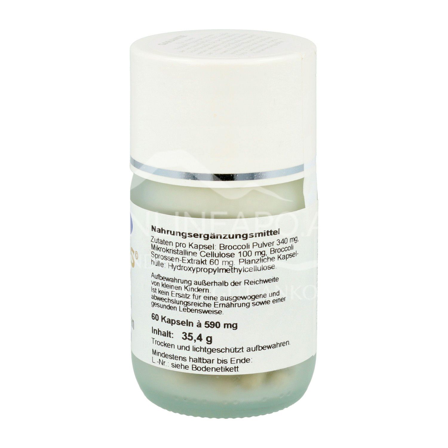 Zutaten pro Kapsel: Broccoli Pulver 340 mg, Broccoli Sprossen-Extrakt 60 mg, Mikrokristalline Cellulose 60 mg. (Pro Kapsel 6 mg Sulforaphan), Pflanzliche Kapselhülle: vegetarische Hydroxypropylmethylcellulose.