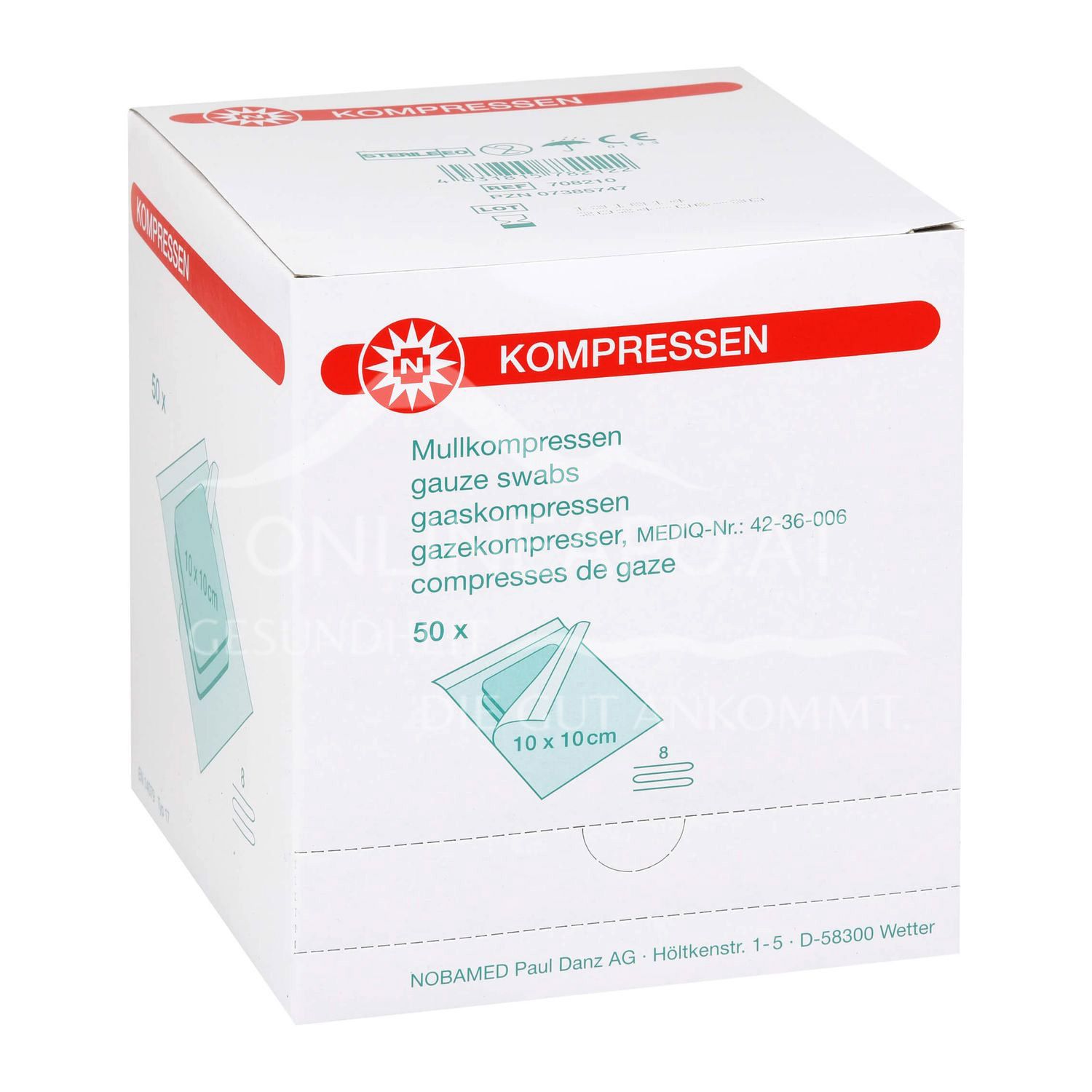 Die Kompressen mit eingeschlagener Schnittkante werden aus 17- fädigem Verbandmull hergestellt. Die Mullkompressen sind mit den Faltrücken nach oben in den Sterilpackungen verpackt, sodass eine einfache Entnahme möglich ist. 50 Sterilpackungen mit je 2 Mullkompressen sind in einer Packung mit praktischem Entnahmeschlitz enthalten.