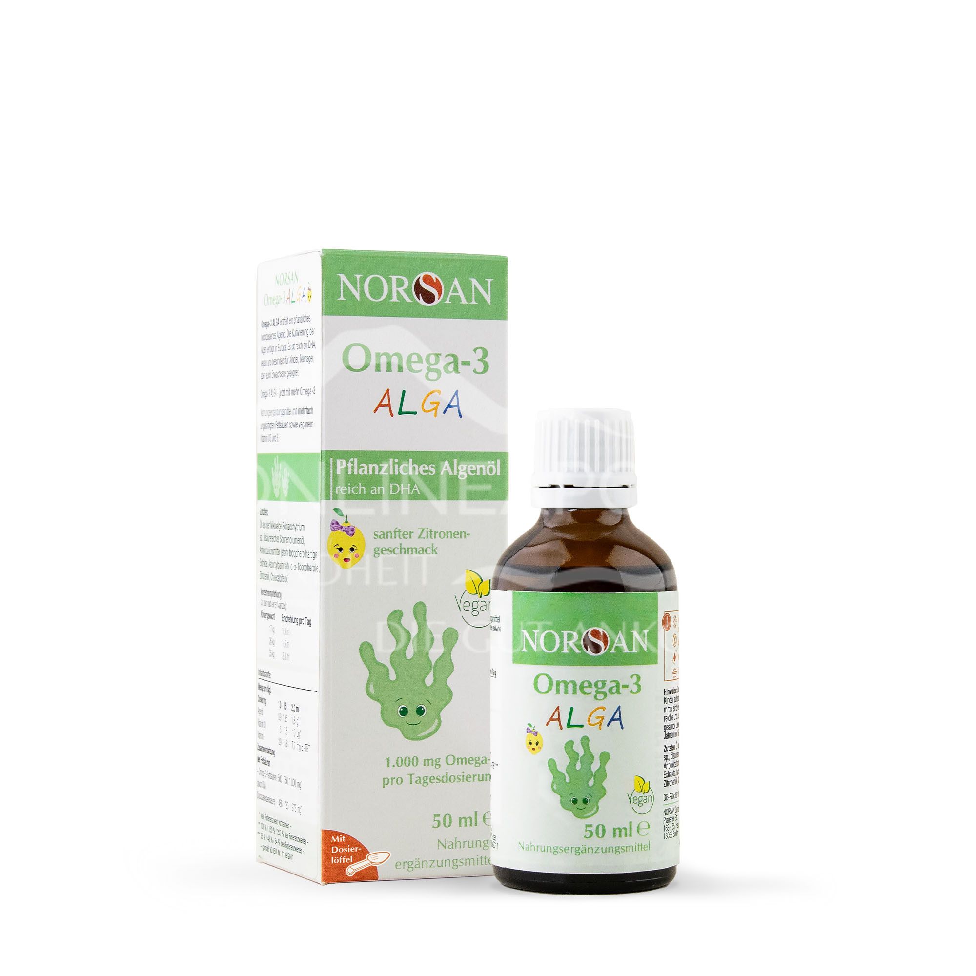 Norsan Omega-3 ALGA contains a vegetable algae oil that is rich in the marine omega-3 fatty acid DHA. It has been specially formulated to meet the needs of children and is easy to dose thanks to the child-friendly dosing spoon.