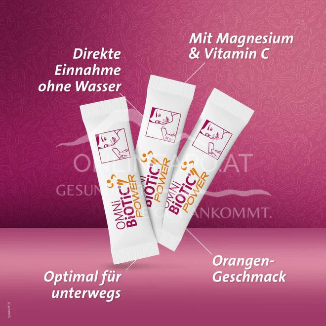 OMNi-BiOTiC® POWER Direkt-Sticks kombinieren sechs gezielt ausgewählte Bakterienstämme mit wertvollem Magnesium. Ideal für die schnelle Einnahme ohne Wasser bei intensiver körperlicher Belastung. Praktisch für unterwegs, mit Orangen-Geschmack.