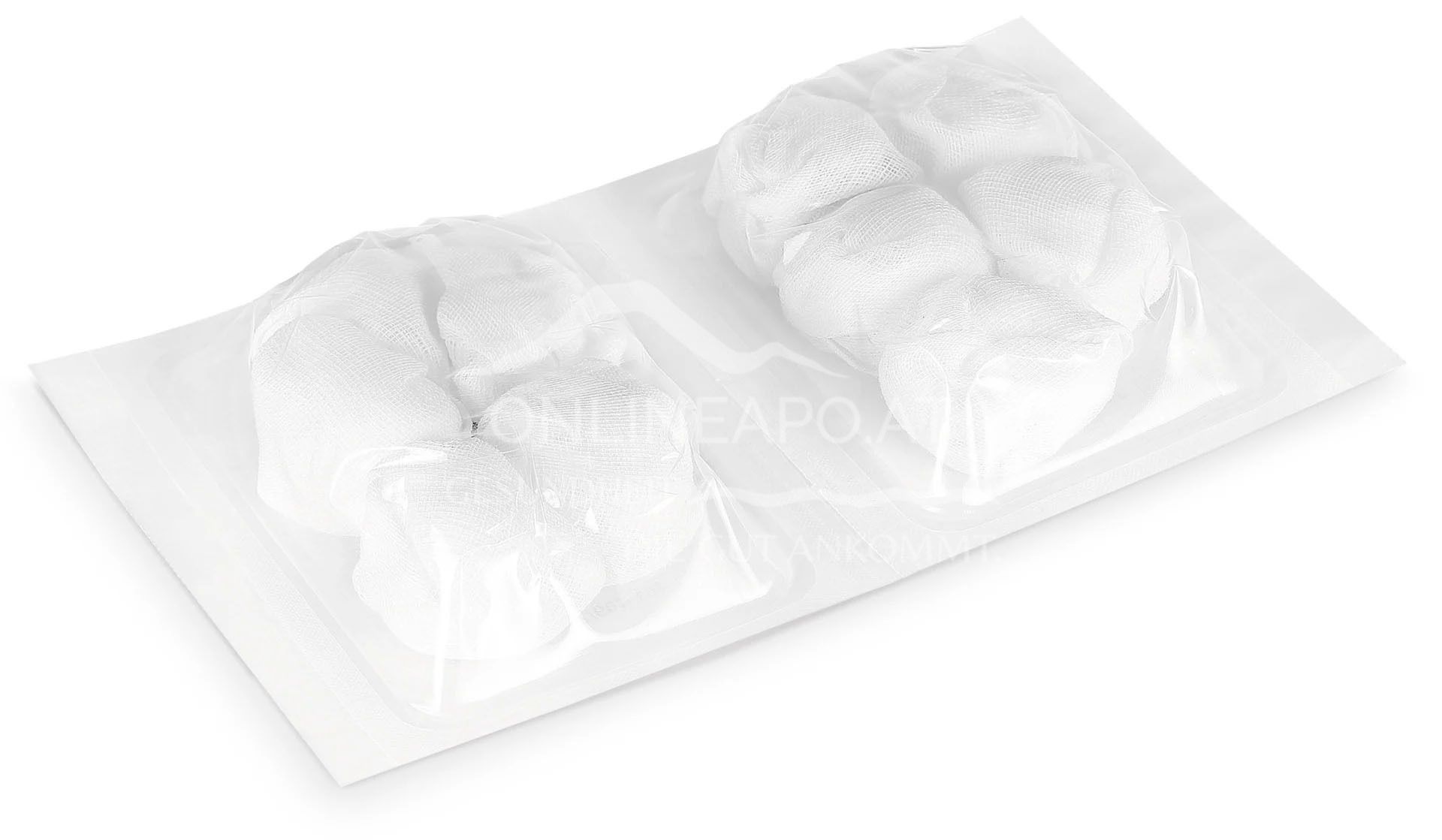 Sling gauze swabs made from EN 14079 gauze, 20-thread, the swab made from a single piece of gauze is interlaced so that the cut edges are securely inside, with high absorption capacity