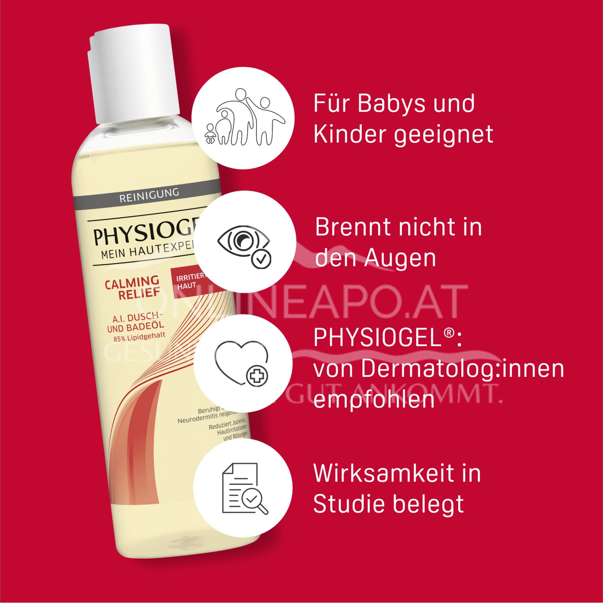 - Tip: Perfect duo for supple, soothed skin: PHYSIOGEL® Calming Relief A.I. Shower and Bath Oil PHYSIOGEL® Calming Relief A.I. Cream or Body Lotion.