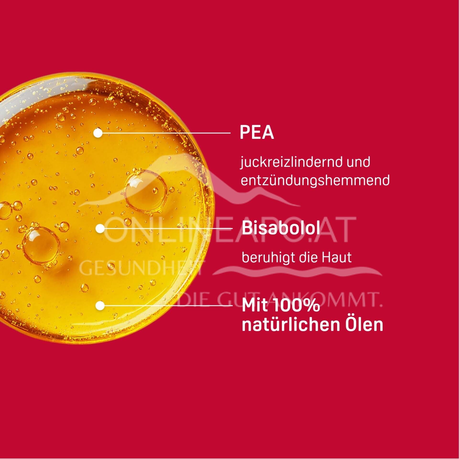For sensitive skin prone to neurodermatitis, conventional cleansing can put additional strain on the weakened skin barrier and exacerbate symptoms such as itching and redness. Calming Relief A.I. Shower Oil has been specially developed to gently cleanse and intensively nourish the skin while showering or bathing. It contains a skin-soothing complex of essential lipids and the soothing active ingredient PEA (palmitoylethanolamine), which relieves itching and inhibits inflammation. The skin is soothed and itching, redness and skin irritation are reduced. After application, the skin feels pleasantly soft and smooth - almost like freshly applied cream. The skin is moisturised and protected from drying out again. The shower and bath oil has been tested on adults and children!