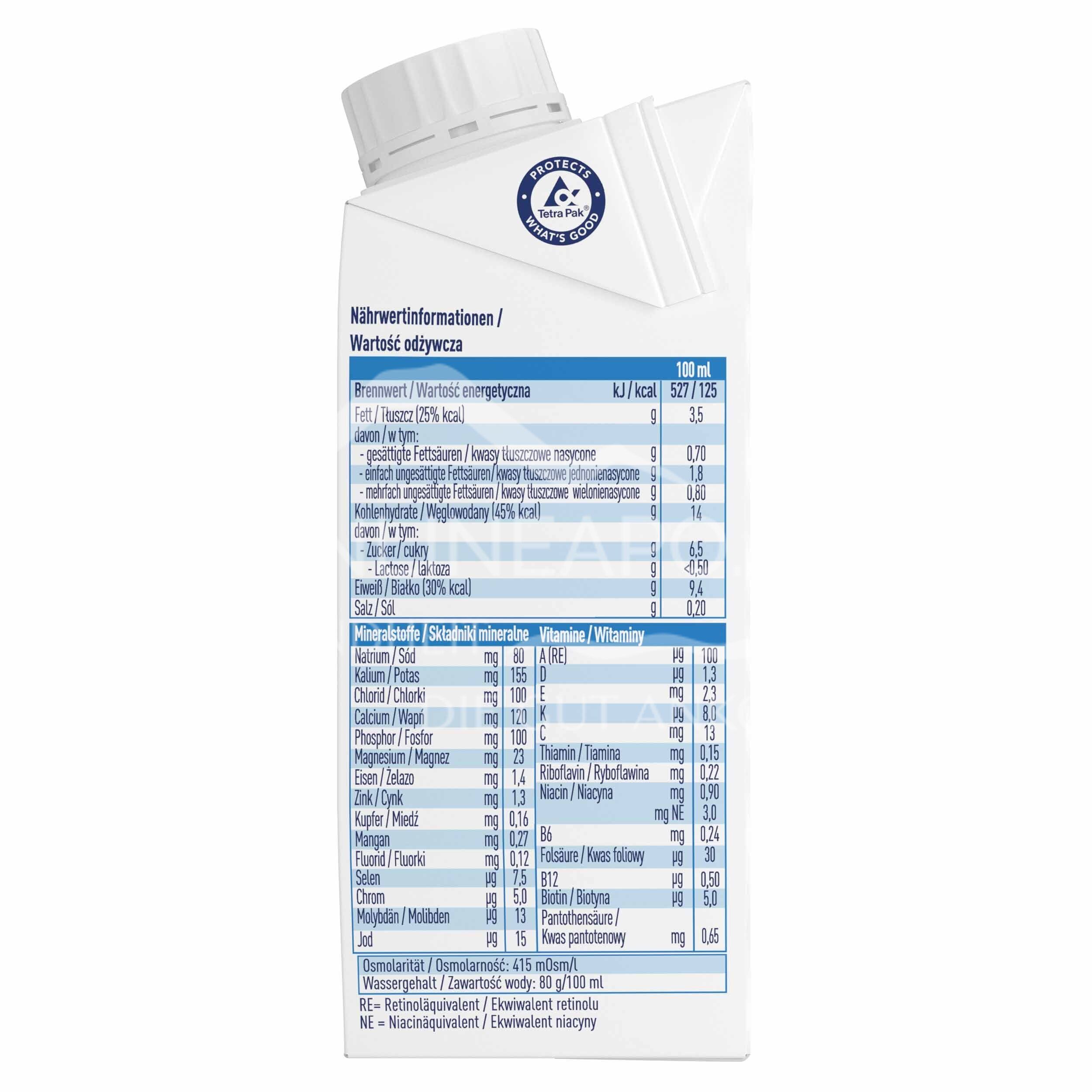 Ingredients: Water, glucose syrup, milk protein, sucrose, rapeseed oil, emulsifier (E471), minerals (potassium chloride, potassium citrate, sodium citrate, magnesium oxide, magnesium citrate, ferrous sulphate, zinc sulphate, manganese sulphate, sodium fluoride, copper sulphate, Chromium chloride, sodium molybdate, potassium iodide, sodium selenate), starch, vitamins (C, E, niacin, pantothenic acid, B6, thiamine, A, riboflavin, folic acid, K, biotin, D, B12), stabiliser (E407), flavouring, colouring (E120), acidity regulators (E525, E330).