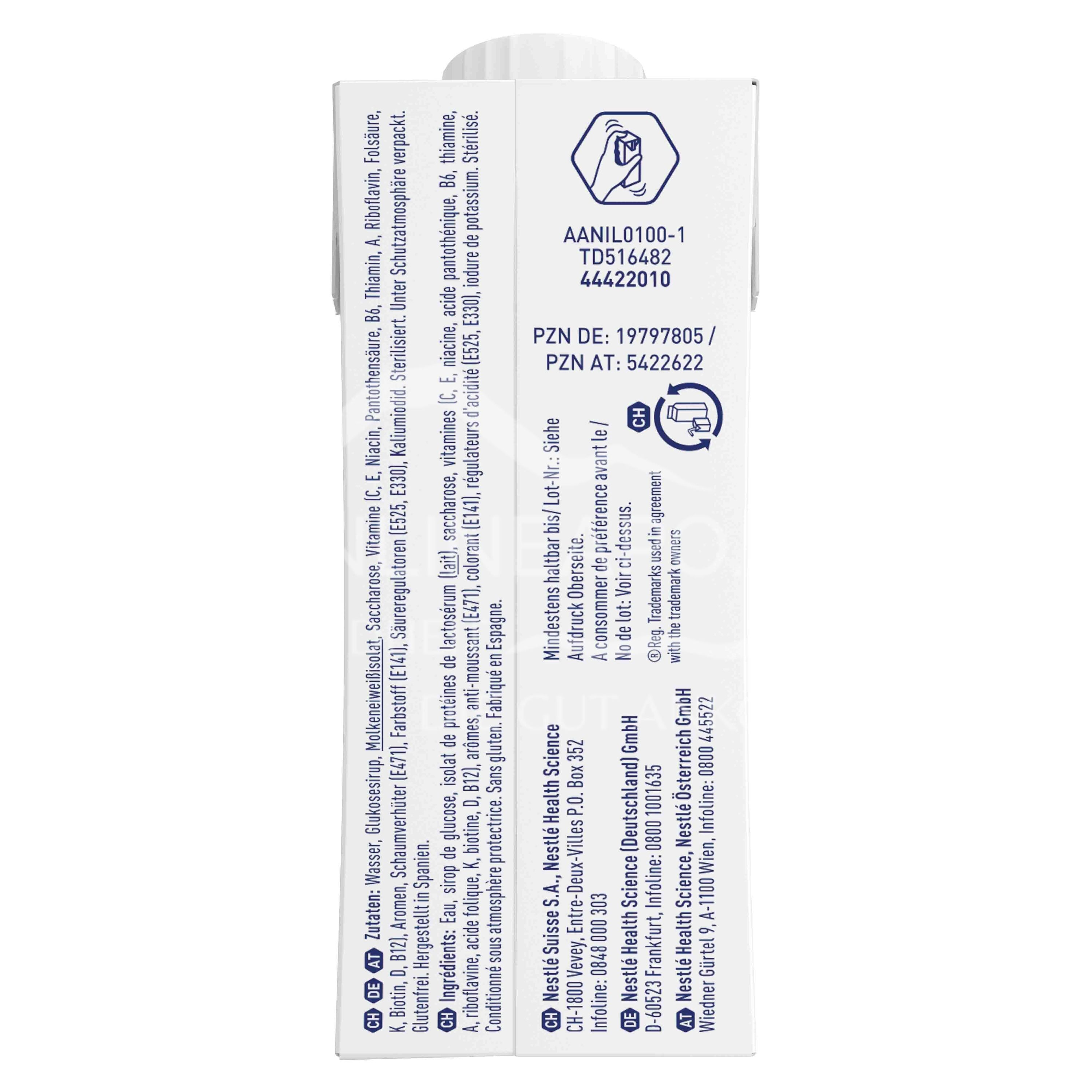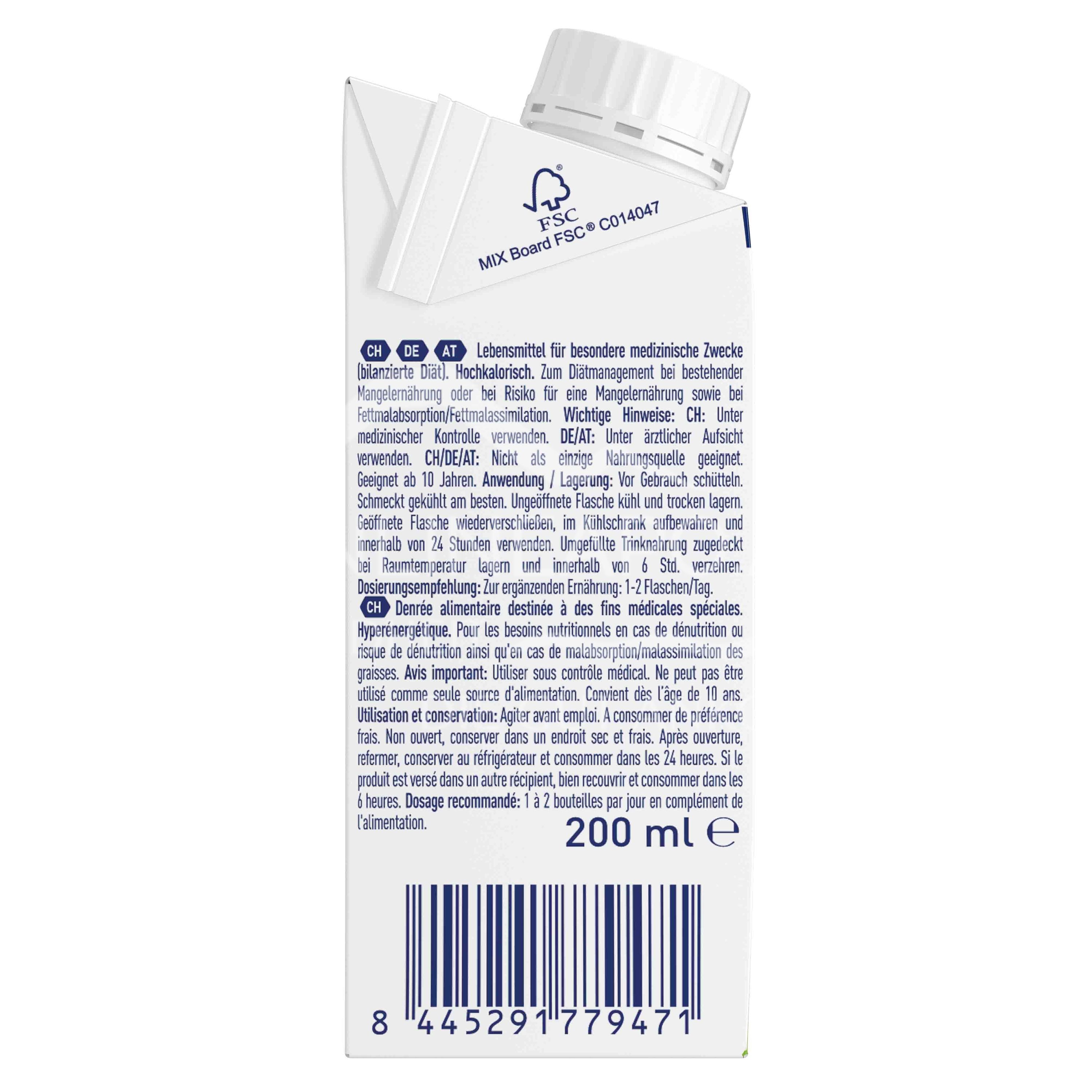 High-protein, high-calorie drinkable food. Food for special medical purposes (balanced diet). For diet management in case of existing malnutrition or risk of malnutrition.
