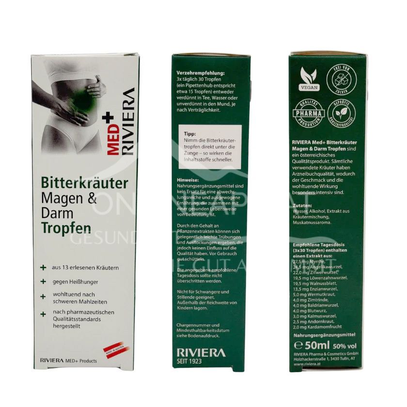 The bitter herbs stomach & intestinal drops from RIVIERA Med+ combine the power of 13 carefully selected herbs. They are ideal for support after heavy meals and help to regulate cravings in a natural way.