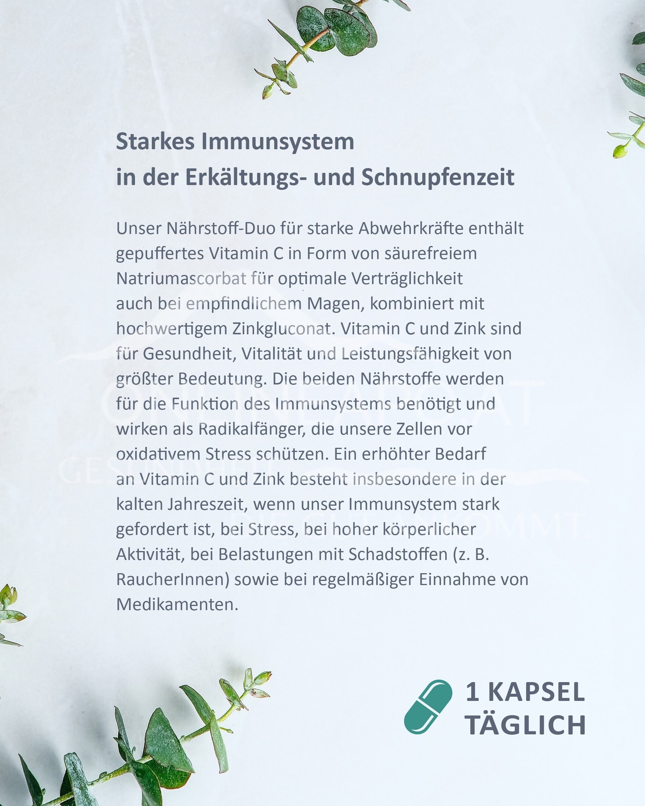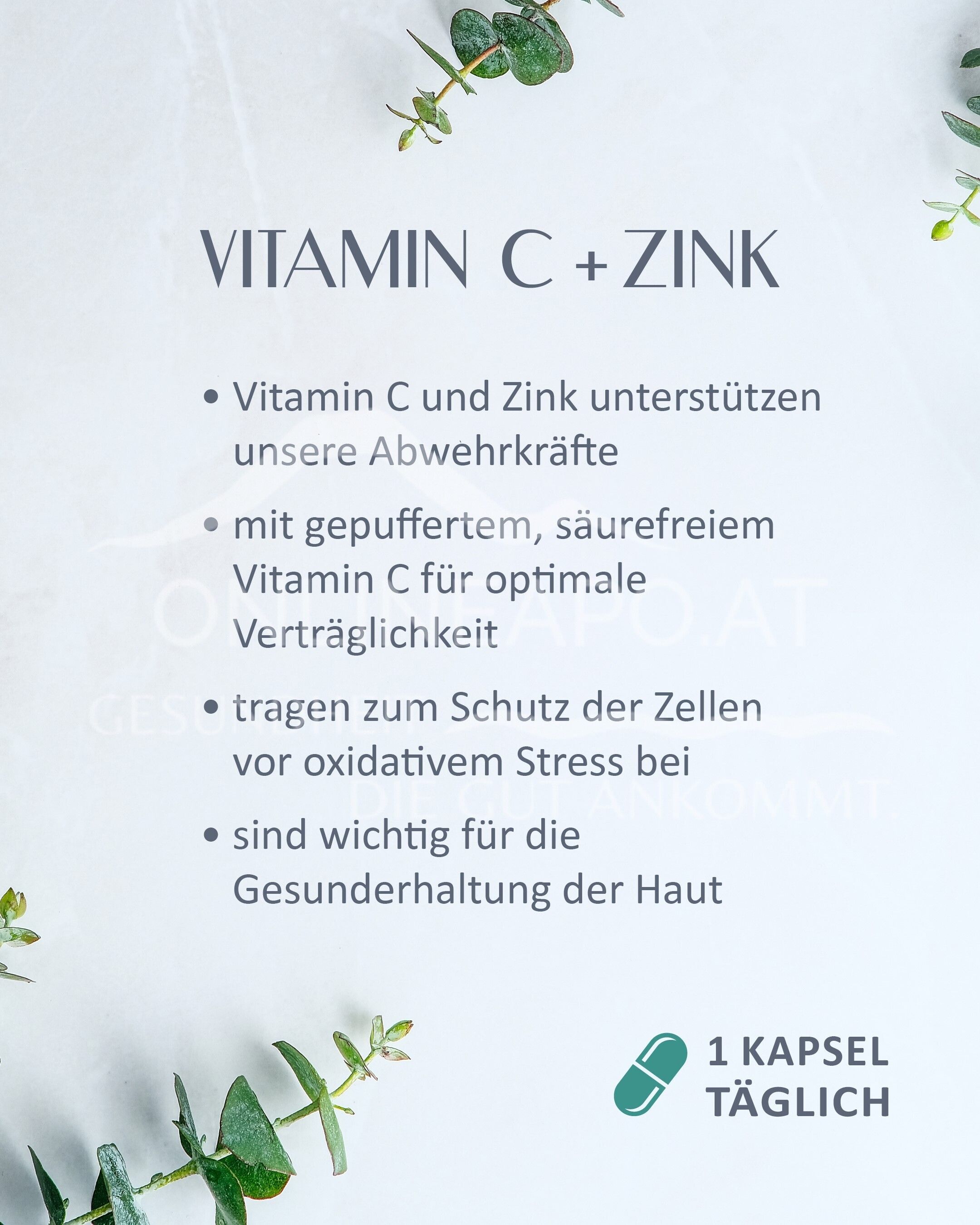 - Zutaten: Natrium-L-ascorbat, Hydroxypropylmethylcellulose (pflanzliche Kapselhülle), Zinkgluconat, Füllstoff: Reismehl.