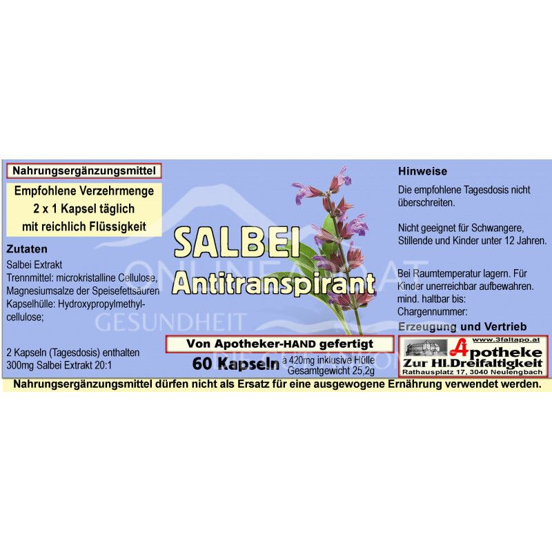 - Ingredients: Sage extract, anti-caking agent: microcrystalline cellulose, magnesium salts of fatty acids Capsule shell: hydroxypropyl methylcellulose.