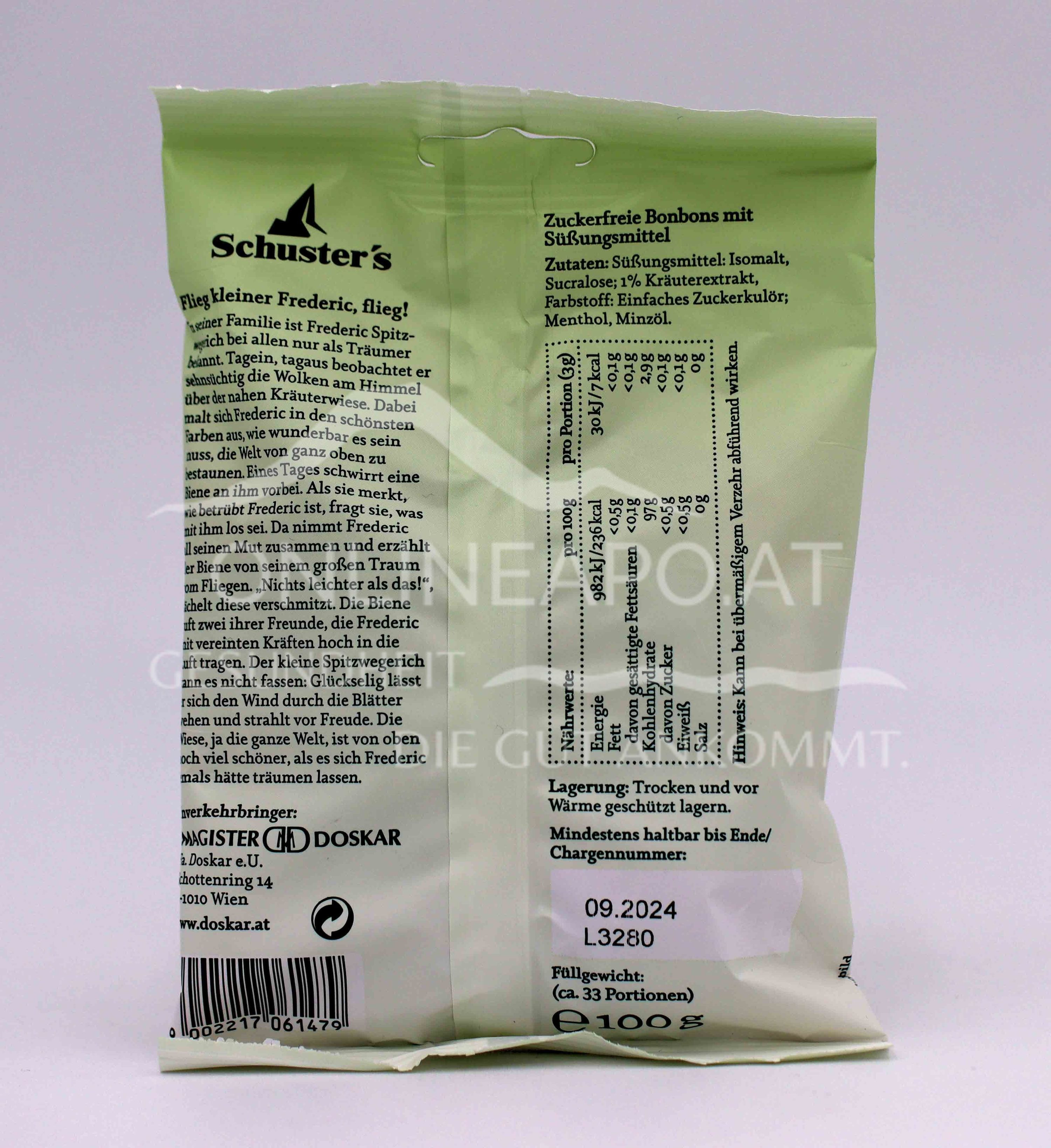 The traditional Schusters brand stands for lovingly told herbal fairy tales and high-quality ingredients - and brings a particularly delicate composition to the palate with "Fly, little Frederic, fly!": herbal extract, menthol and mint oil give this sweet a pleasantly fresh flavour, without any sugar. Inspired by Frederic's dream of flying, this herbal sweet invites you to pause and take a deep breath