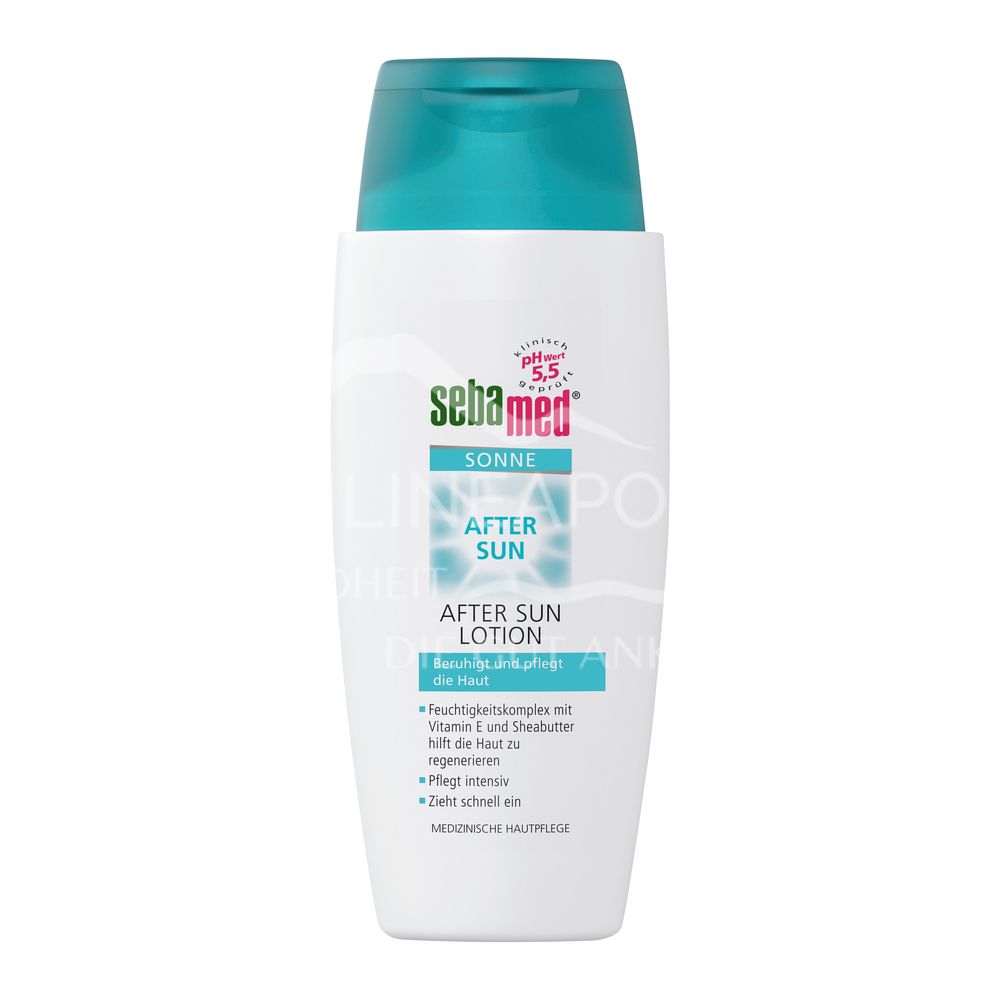 Daily care after sunbathing. The sebamed after-sun lotion soothes overheated skin after sunbathing. The pH value of 5.5 stabilises the skin's protective layer. Moisturising complex with vitamin E and shea butter helps to regenerate the skin Intensive care Quickly absorbed The formula with phytosterols soothes skin irritated by the sun. A rich moisturising complex with vitamin E and shea butter restores the skin's moisture content. The effectively nourished skin brings out the tan. Vitamin E neutralises free radicals and helps to soothe the skin