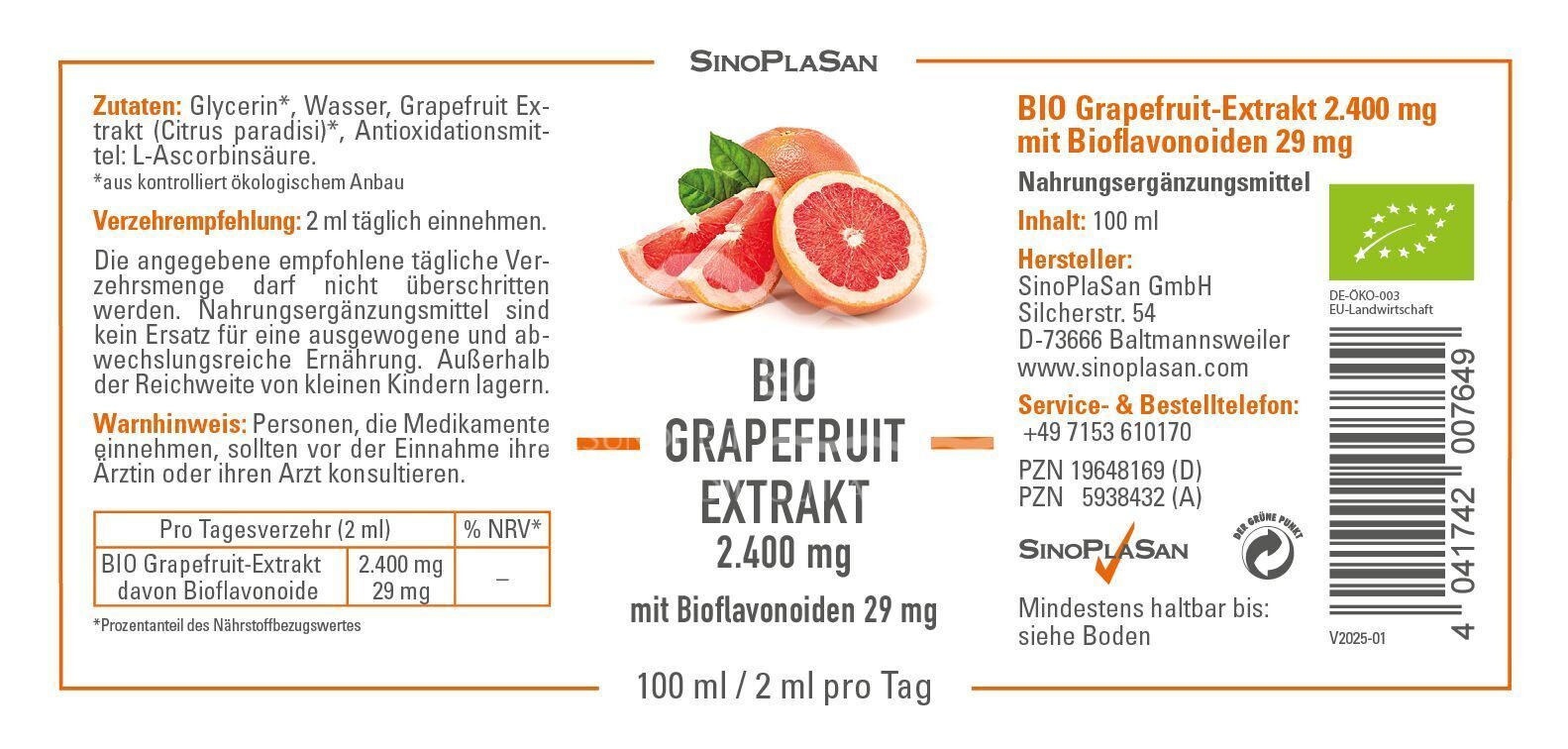 - Zusammensetzung pro Tagesdosis (2 ml): 2400 mg BIO Grapefruit-Extrakt, davon 29 mg Bioflavonoide.