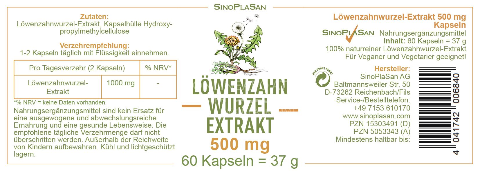 Product information "SinoPlaSan dandelion root extract 500 mg capsules"