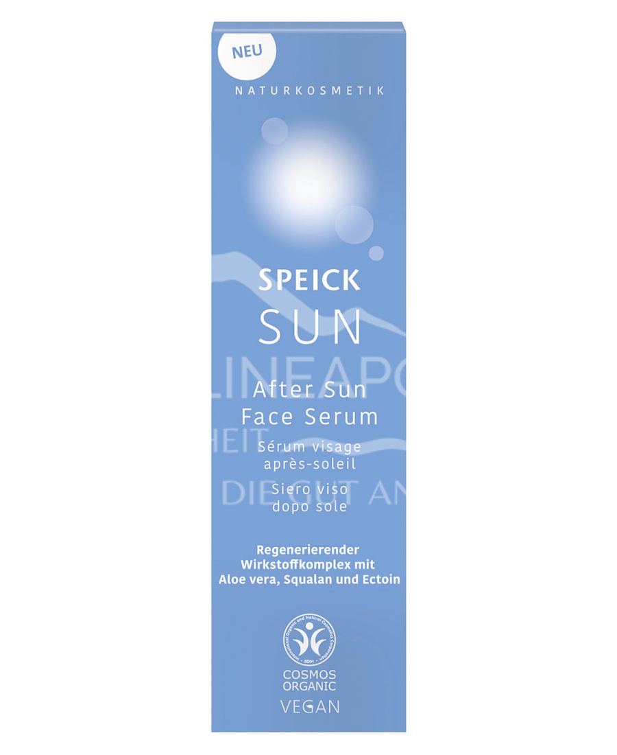 Moisturising intensive care. Highly concentrated serum for the care of sun-stressed skin on the face, neck and décolleté. This active ingredient complex with 80 % organic aloe vera gel combines rich moisturising care with soothing skin soothing. Squalane gives the skin a silky feel and preserves its moisture. Extracted from olive oil. Ectoin protects the skin from external environmental influences. Also suitable for sensitive skin. With the unique extract of the high alpine Speick plant (kbW)