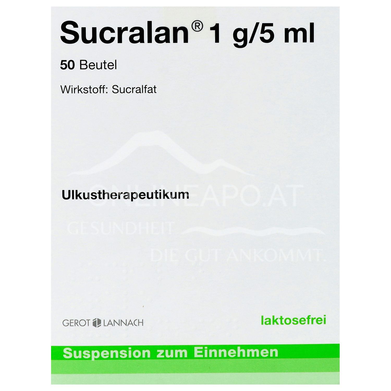 Die Sucralan® 1 g/5 ml orale Suspension Beutel sind ein rezeptfreies Arzneimittel mit dem Wirkstoff: Sucralfat. Sucralan® wirkt lokal, direkt an der Speiseröhren-, Magen- und Zwölffingerdarmschleimhaut.