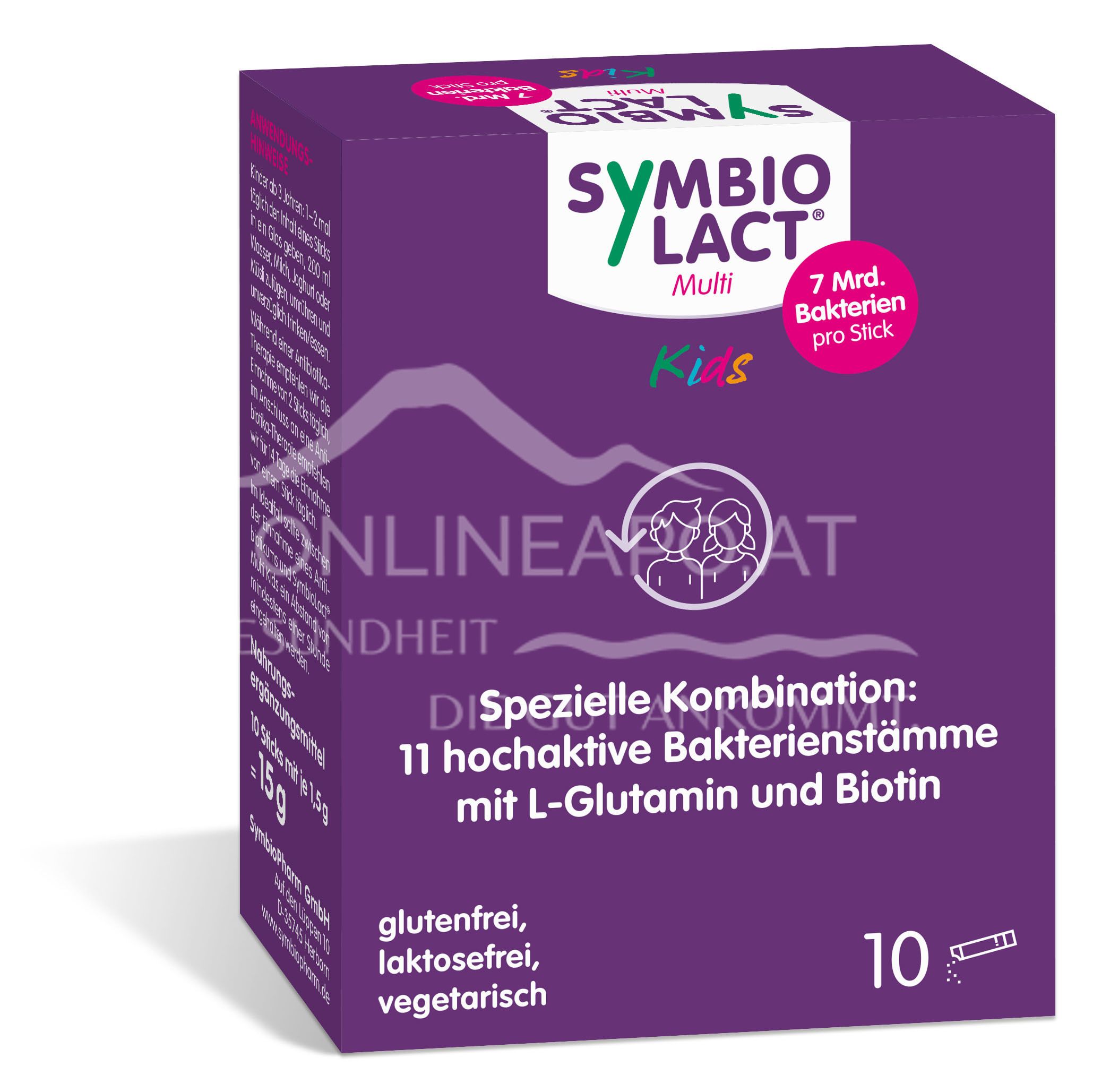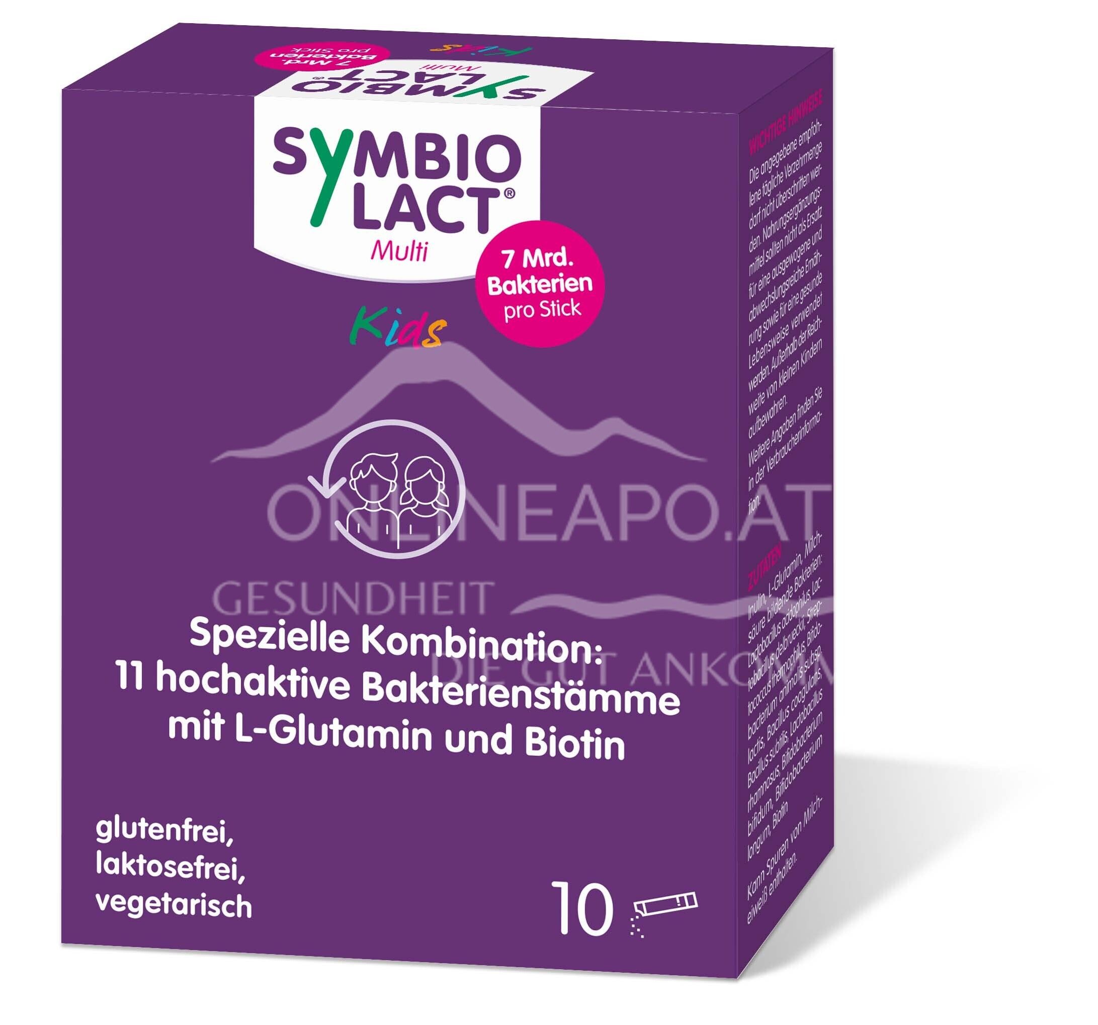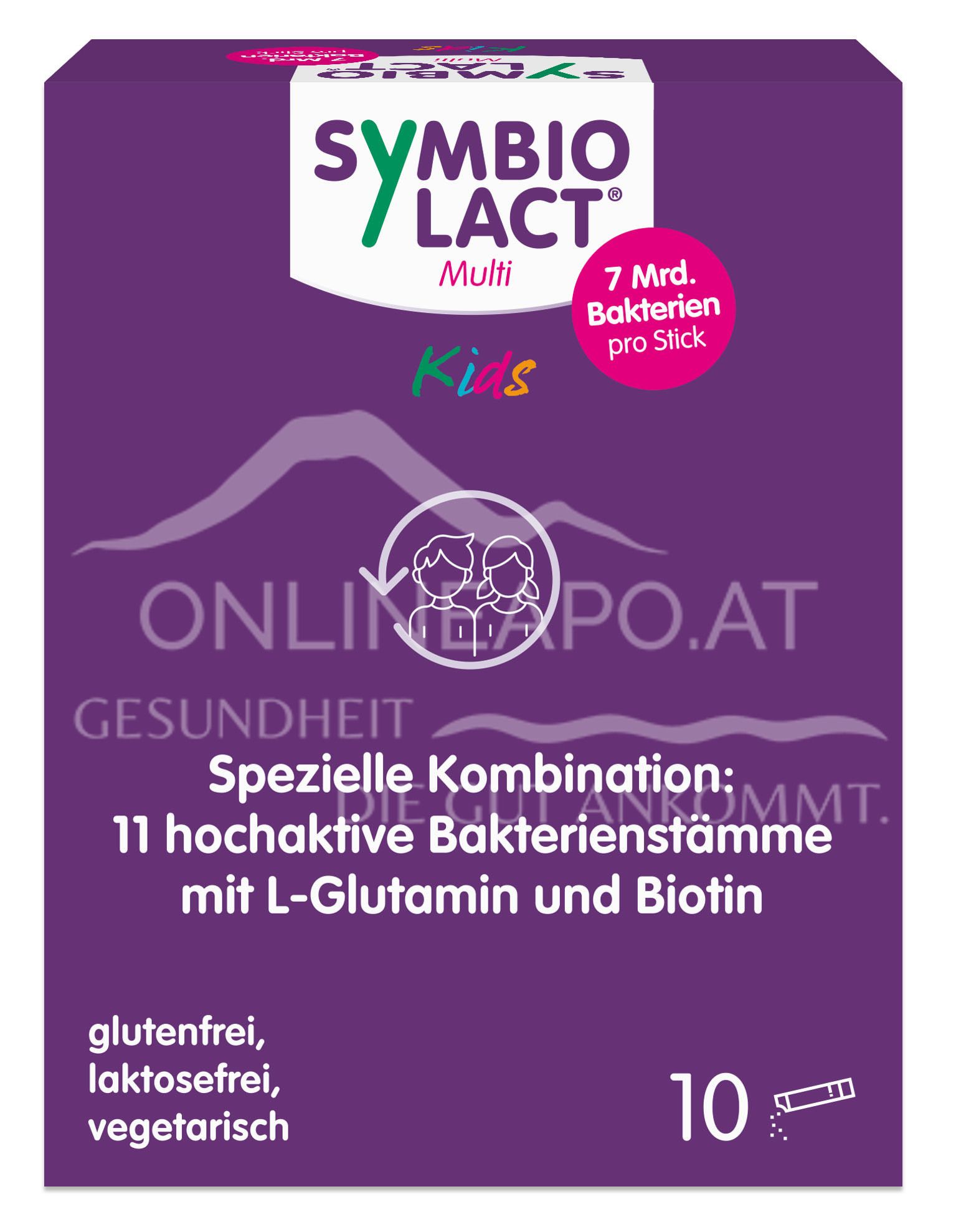 SymbioLact® Multi Kids Sticks are a food supplement with a special combination of selected lactic acid bacteria, biotin and L-glutamine. The high-dose combination contains 7 billion freeze-dried bacteria per day.