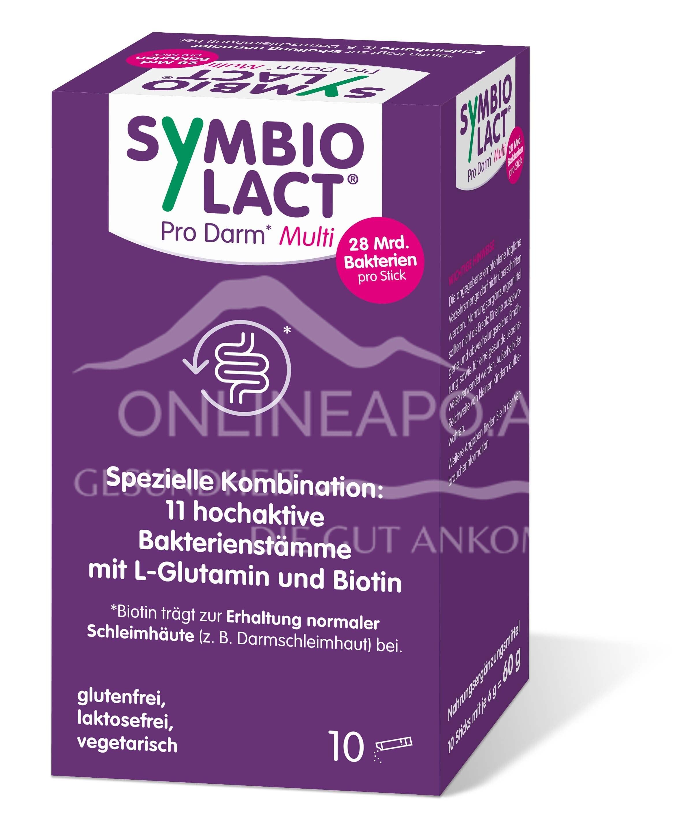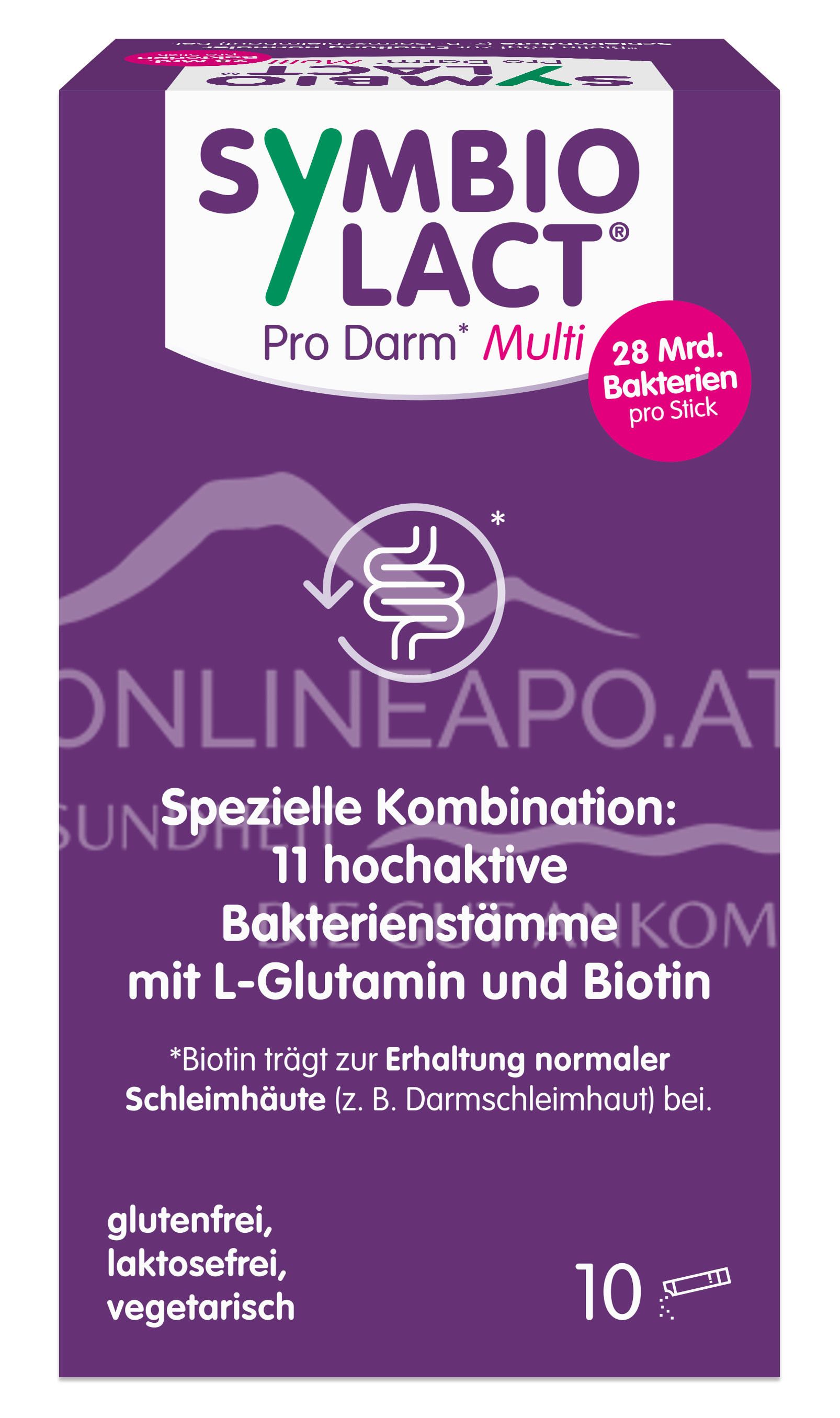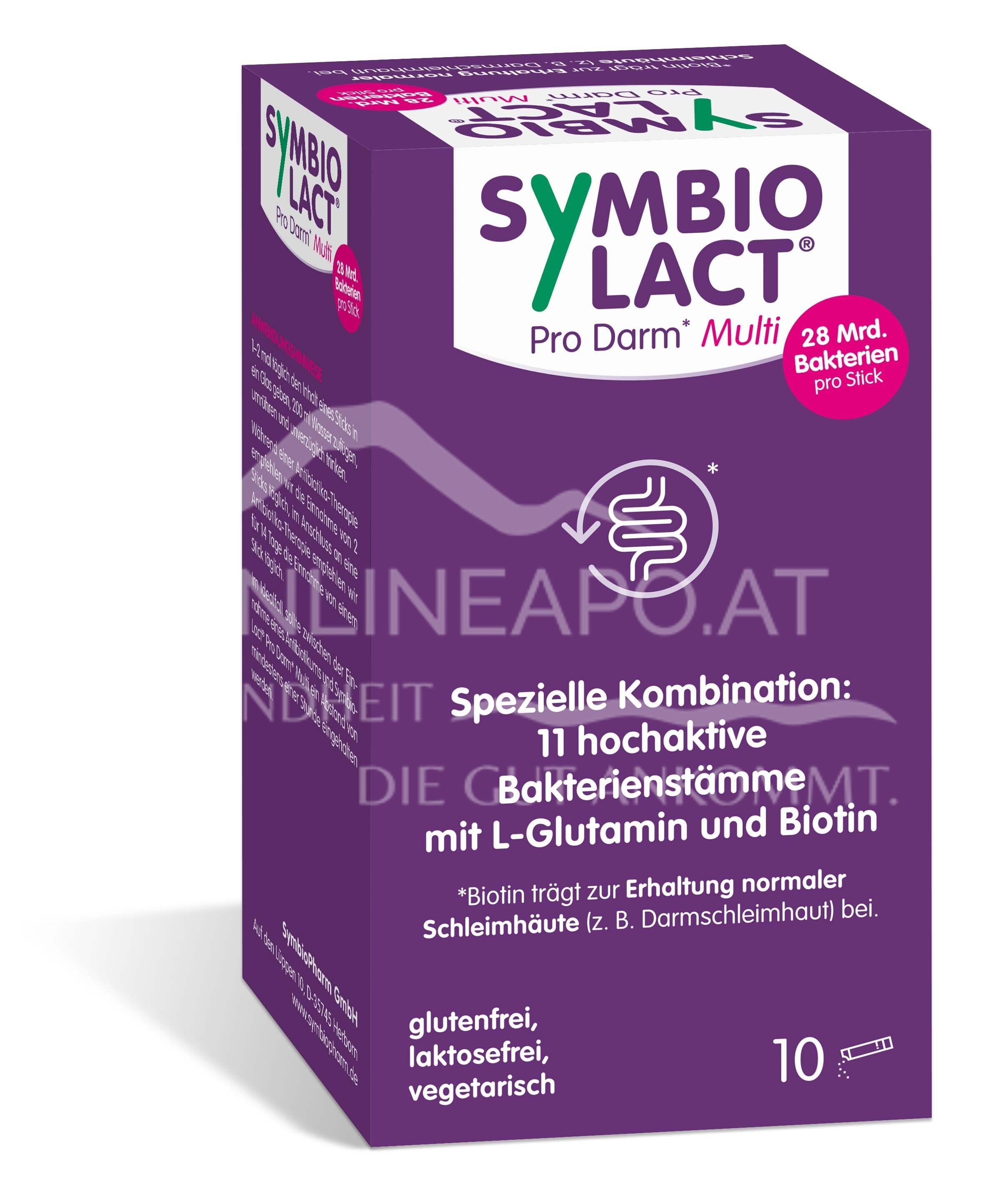 - 1 portion of SymbioLact® Pro Darm* Multi (1 stick) contains a mixture of freeze-dried lactic acid bacteria from Lactobacillus delbrueckii (LBY-27™), Lactobacillus acidophilus (DDS-1®), Streptococcus thermophilus (STY-31™), Lactobacillus acidophilus (LA-5®), Bifidobacterium animalis subsp. lactis (UABla-12™), Bacillus coagulans (SC208™), Bacillus subtilis (HU58™), Bifidobacterium animalis subsp. lactis (BB-12®), Lactobacillus rhamnosus (LGG®), Bifidobacterium bifidum (UABb-10™), Bifidobacterium longum (UABl-14™) with a total bacterial count of ≥ 2.8 × 1010 CFU (colony-forming units). The bacterial strains mentioned are (registered) trademarks of Chr. Hansen A/S or Novonesis Group.