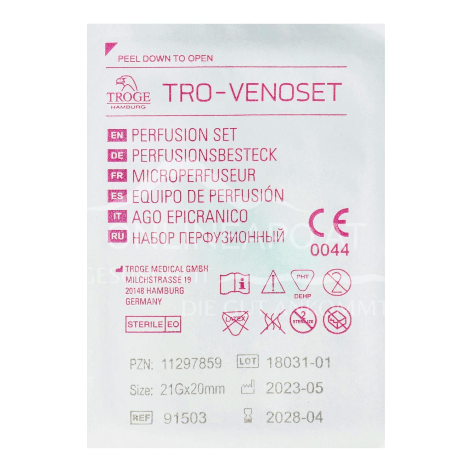 The TRO-VENOSET perfusion set is a sterile, pyrogen-free and atoxic medical device for the intravenous administration of medication, blood products and nutrient solutions.