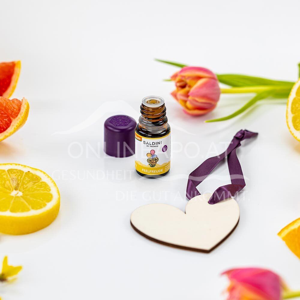 Scented greetings from the heart for you! Lemon, grapefruit and orange ensure cheerfulness and a good mood. The refreshing and uplifting Feelfreude® blend (5 ml) contains 100% pure natural essential oils and can be dripped directly onto the heart-shaped wooden pendant, which diffuses the fragrance in no time at all