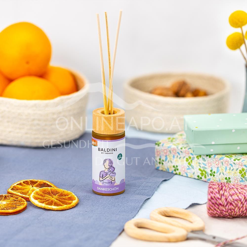 Say "thank you" with a fragrance! The Baldini Dankeschön room fragrance set from Taoasis with 100% pure natural essential oils. Refreshing clementine, balancing rose geranium and euphoric tonka provide well-being, serenity and inner peace.