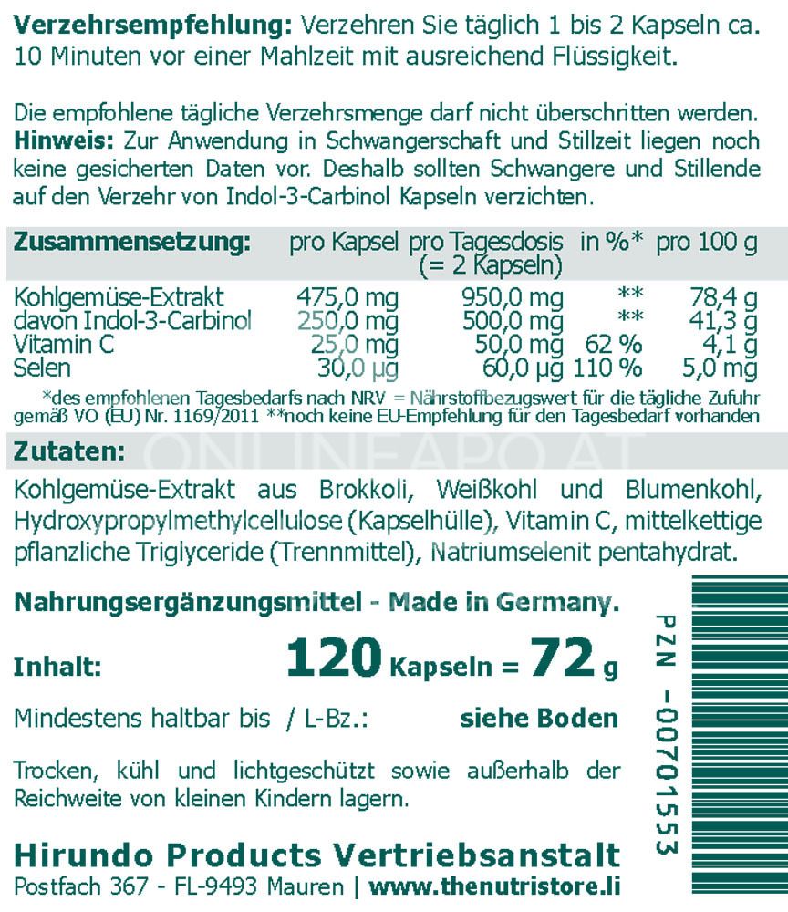 The raw material used to manufacture the capsule shell is obtained from vegetable cellulose and is gelatine-free. The odour of the product is characteristic of cruciferous vegetables and does not impair the quality of the product. Indole-3-carbinol capsules are a natural product. There may be harvest-related variations in the colour of the capsules. This does not affect the quality of the product.
