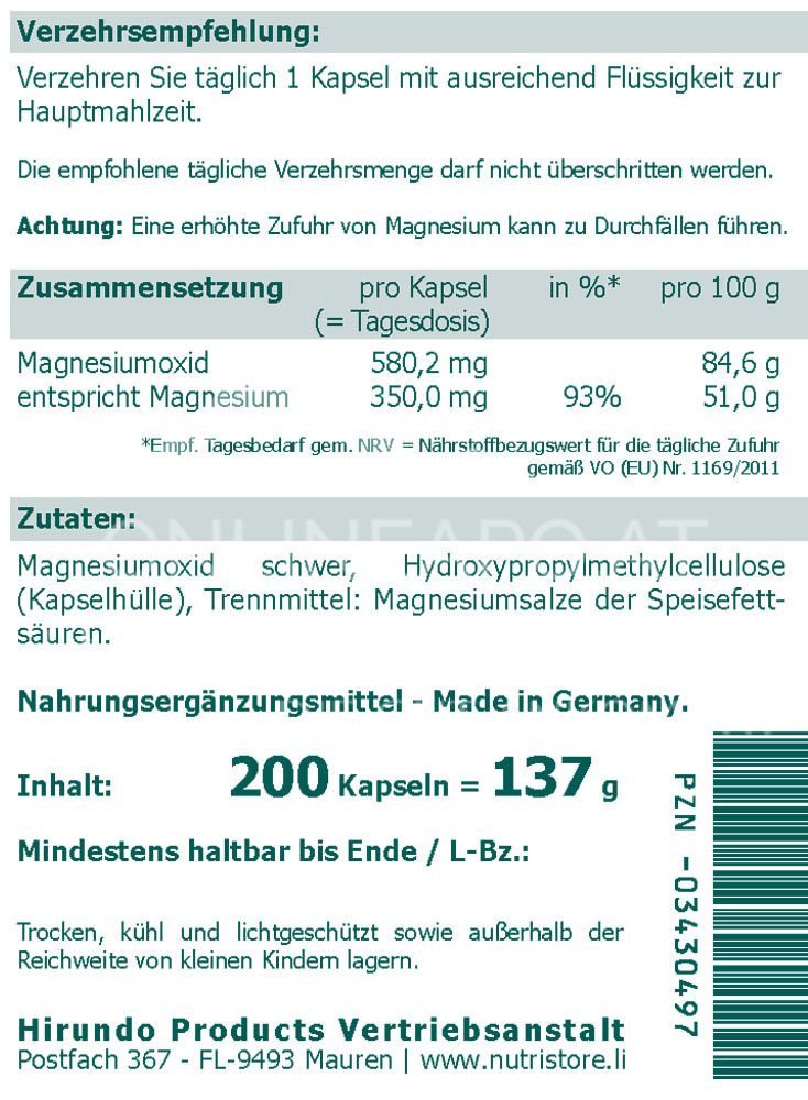 Each vegan magnesium capsule contains 350 mg magnesium. Daily supplementation with Magnesium 350 mg capsules can ensure that your body is adequately supplied with this essential mineral. The raw material used to manufacture the capsule shell is obtained from vegetable cellulose and is gelatine-free.