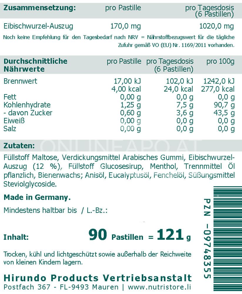 - Average nutritional information per daily dose (= 6 pastilles): calorific value 102.0 kJ 24.0 kcal, fat 0.0 g, carbohydrates 7.5 g - of which sugar 3.6 g, protein 0.00 g, salt 0.00 g. * Recommended daily intake according to NRV = nutrient reference value for daily intake according to Regulation (EU) No. 1169/2011. ** No reference quantity available yet.