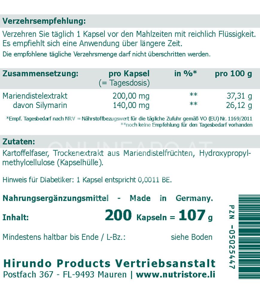 - Composition per daily dose (= 1 capsule) %NRV*: Milk thistle extract 200 mg ** of which silymarin 140 mg ** *of the recommended daily intake according to NRV = nutrient reference value for daily intake according to Regulation (EU) No. 1169/2011 **no EU recommendation for daily intake yet available.