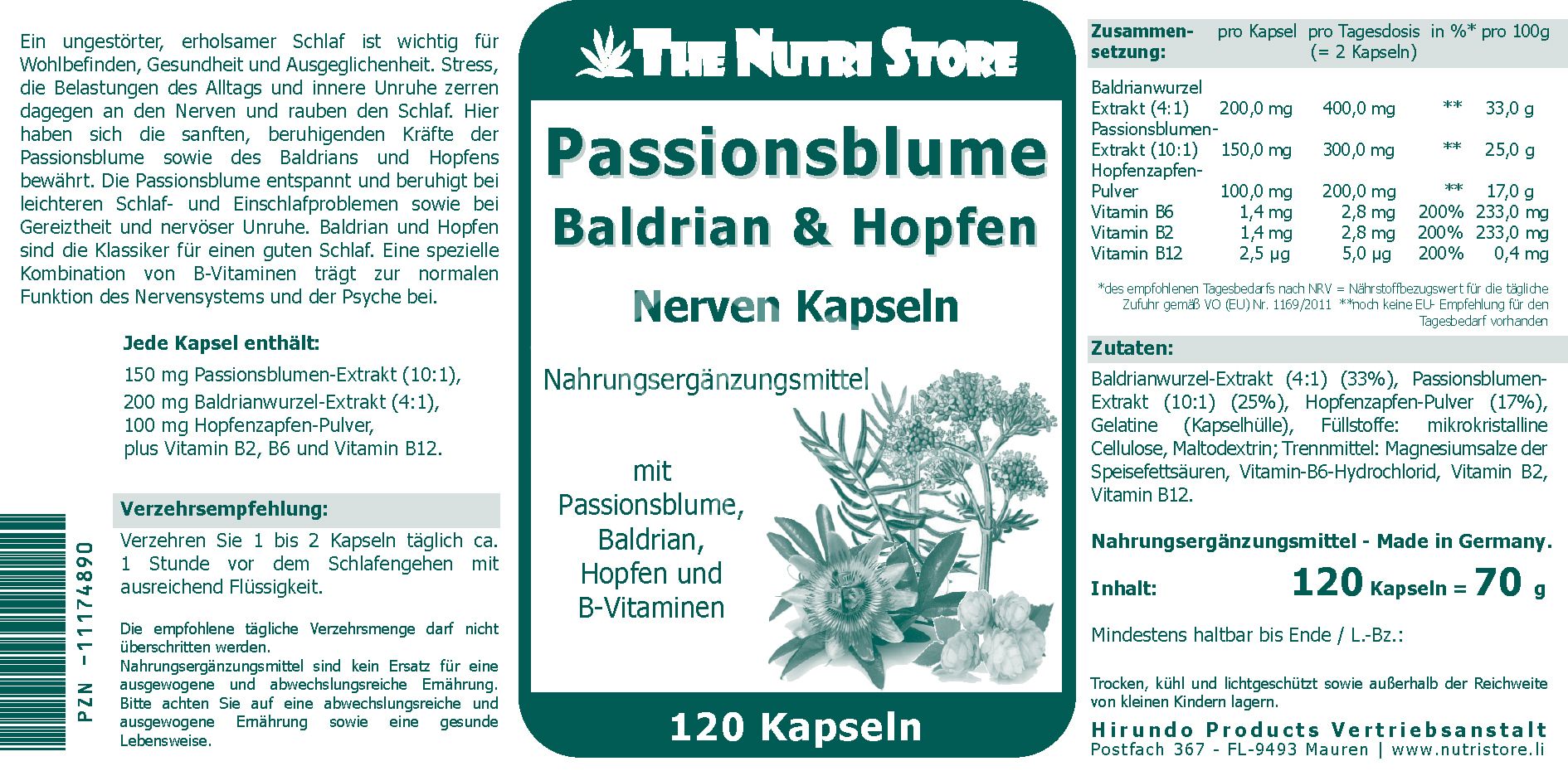 - Zusammensetzung pro Tagesdosis (2 Kapseln) %NRV*: BaldrianwurzelExtrakt (4:1) 400,0 mg **, Passionsblumen-Extrakt (10:1) 300,0 mg **, Hopfenzapfen-Pulver 200,0 mg **, Vitamin B6 2,8 mg 200%, Vitamin B2 2,8 mg 200%, Vitamin B12 2,5 µg 5,0 µg 200%. * Empfohlener Tagesbedarf nach NRV = Nährstoffbezugswert für die tägliche Zufuhr gemäß Verordnung (EU) Nr. 1169/2011. **noch keine EU- Empfehlung für den Tagesbedarf vorhanden.