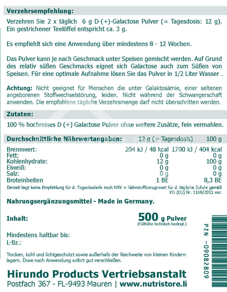 - Zutaten: 100 % hochreines D (+) Galactose Pulver (aus Milch) ohne weitere Zusätze, fein vermahlen.