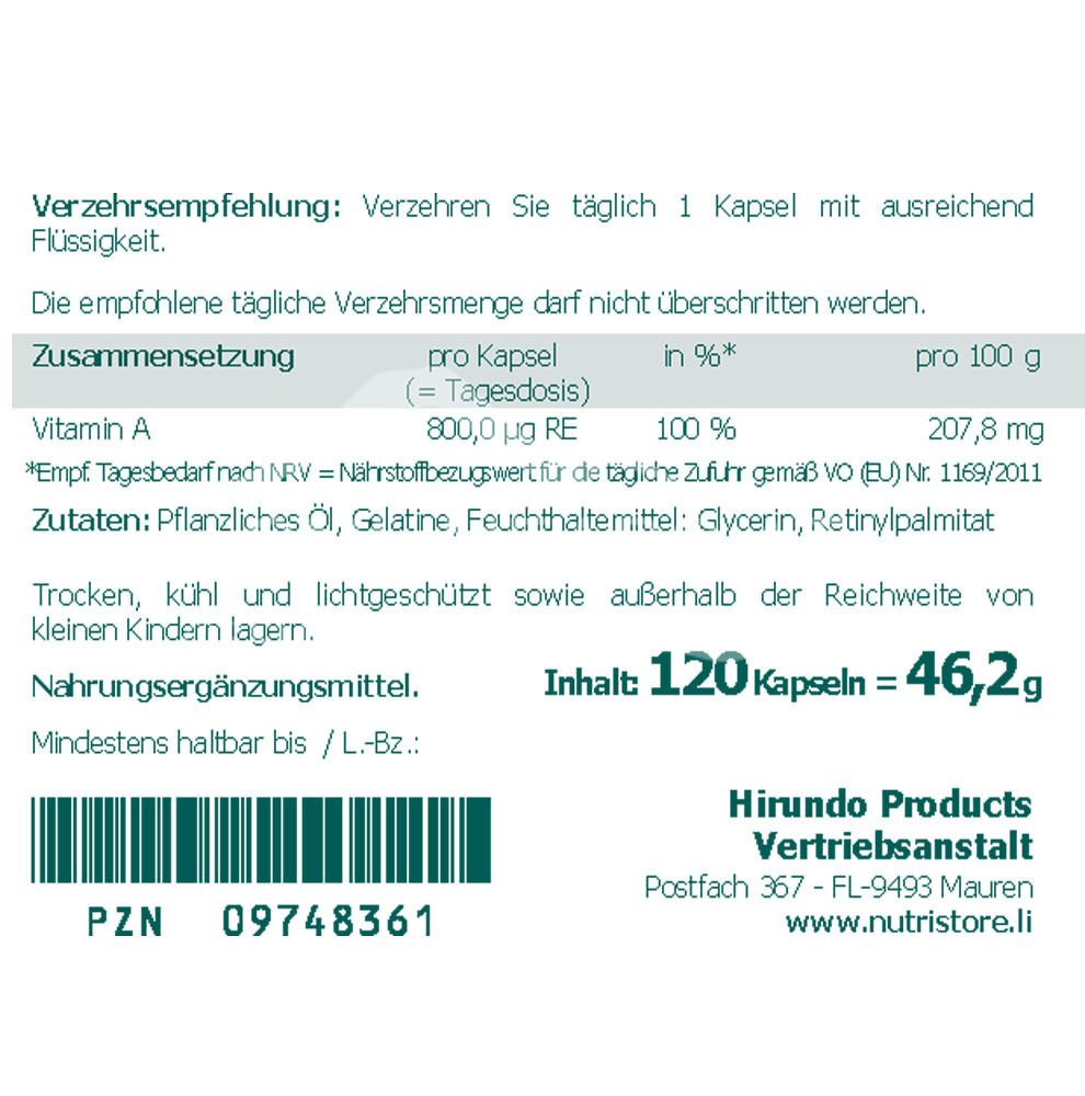 - Zusammensetzung pro Tagesdosis (1 Kapseln) %NRV*: Vitamin A 800 µg 100 %.