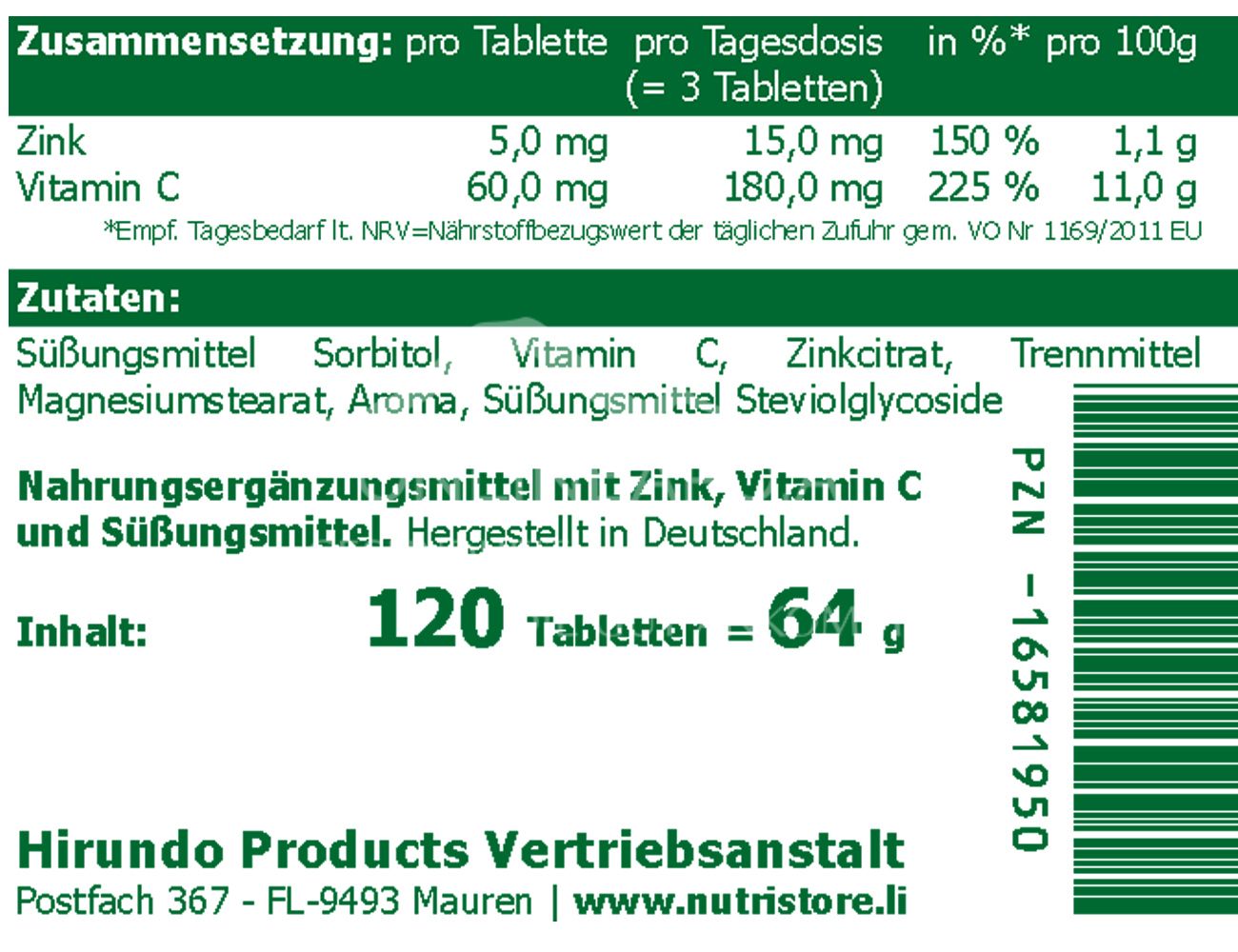 - Composition per daily dose (3 lozenges) %NRV*: Zinc 15.0 mg 150 %, vitamin C 180.0 mg 225 % *Recommended daily intake according to NRV = nutrient reference value of the daily intake according to Regulation No. 1169/2011 EU.
