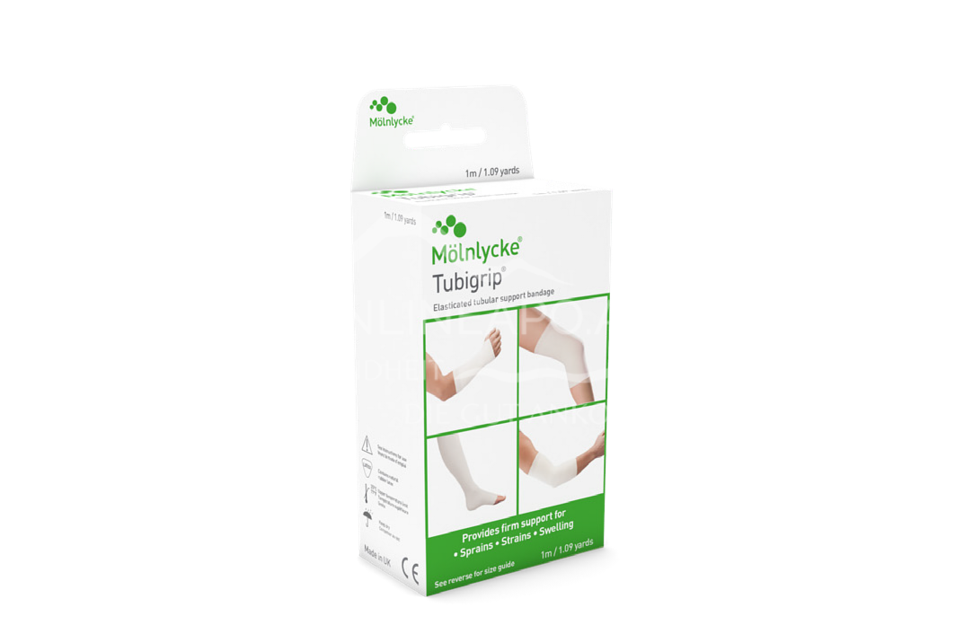 Tubigrip provides firm support for sprains, strains and swelling. The product provides even and consistent compression (5-30 mmHg sub-bandage pressure under a double layer). Tubigrip provides more even pressure levels over a wide range of limb circumferences compared to latex-free elasticated tubular bandages*.