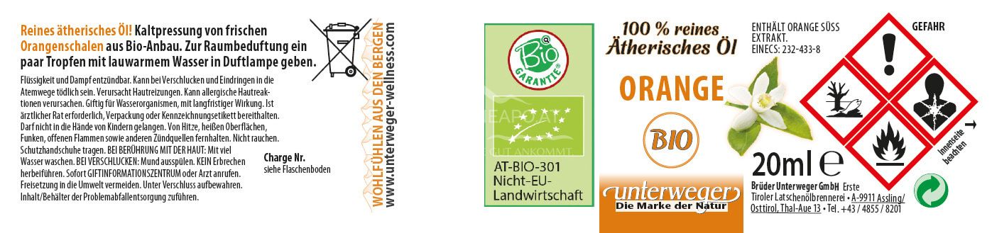 Entdecken Sie die pure Kraft des Unterweger Bio Orangenöls. 100 % naturreines ätherisches Öl aus Kaltpressung zur Hebung der Stimmung und für pure Entspannung. Ideal für die Duftlampe, den Diffuser oder als wohltuender Badezusatz.