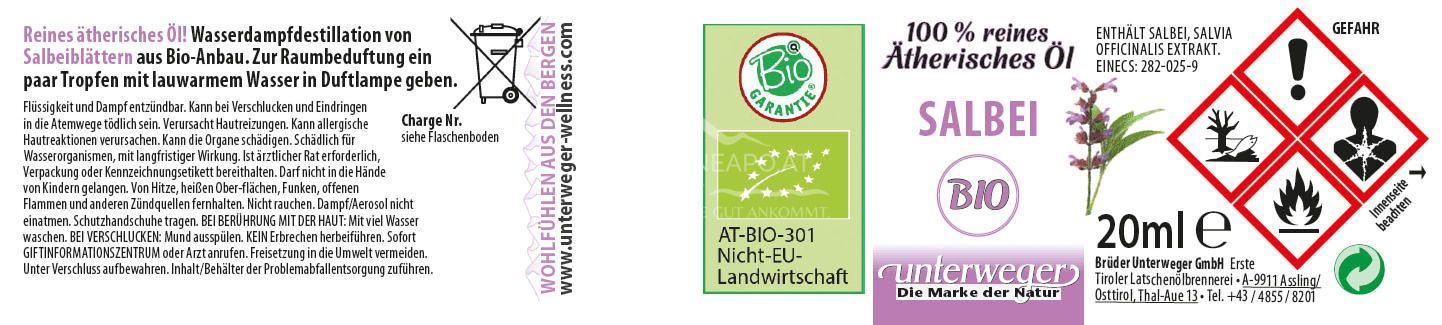 Die 100% reinen und BIO ätherischen Öle enthalten die Lebenskraft der Pflanzen in konzentrierter Form. Die wertvollen aromatischen Essenzen werden zum größten Teil durch Wasserdampfdestillation aus Salbeiblättern gewonnen. Hergestellt gemäß AT-BIO-301