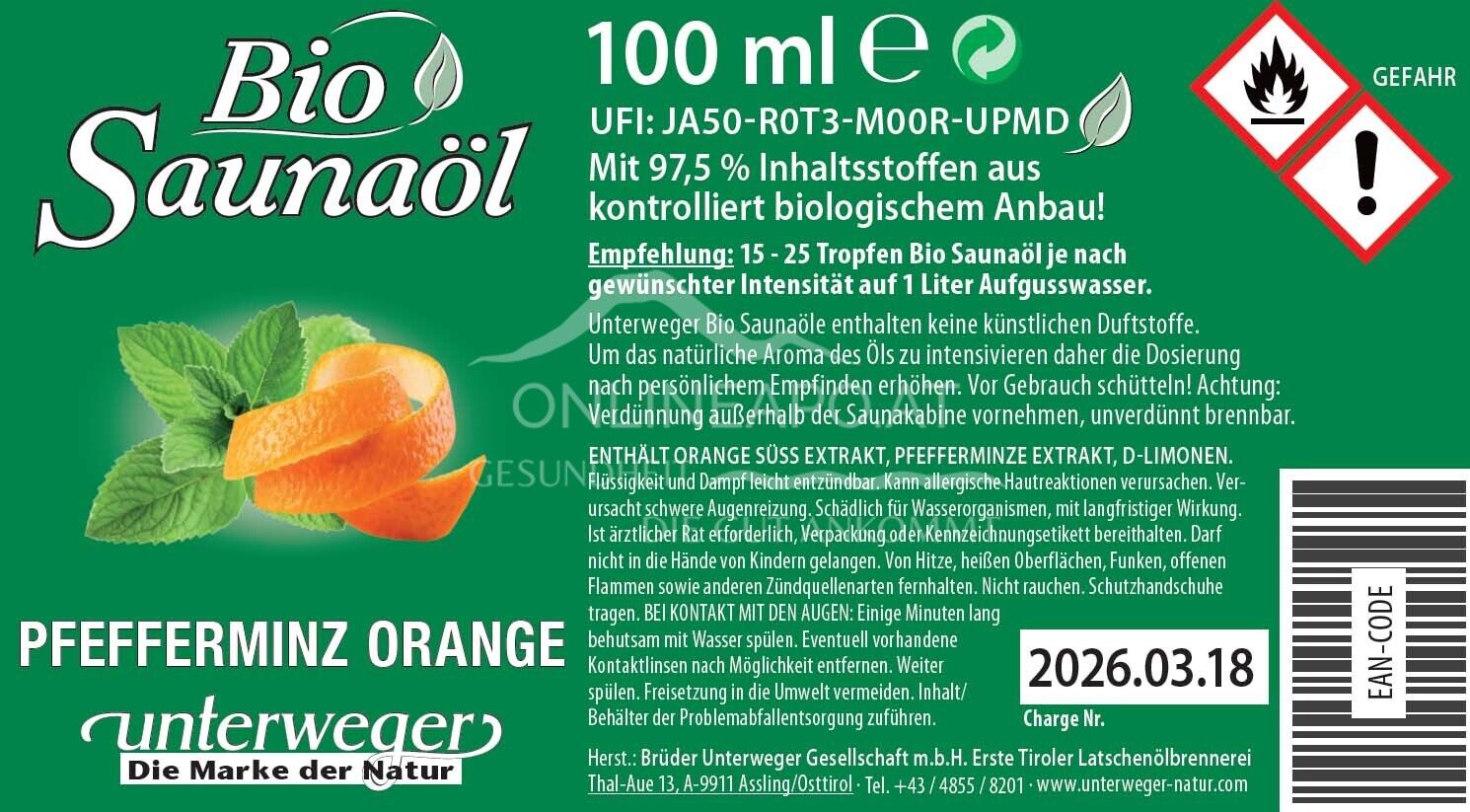 Erleben Sie pure Erfrischung! Das Unterweger Bio Saunaöl mit Pfefferminz & Orange belebt Körper und Geist. 100% naturreine ätherische Öle aus kontrolliert biologischem Anbau sorgen für einen klaren, fruchtig-frischen Duft in Ihrer Sauna.