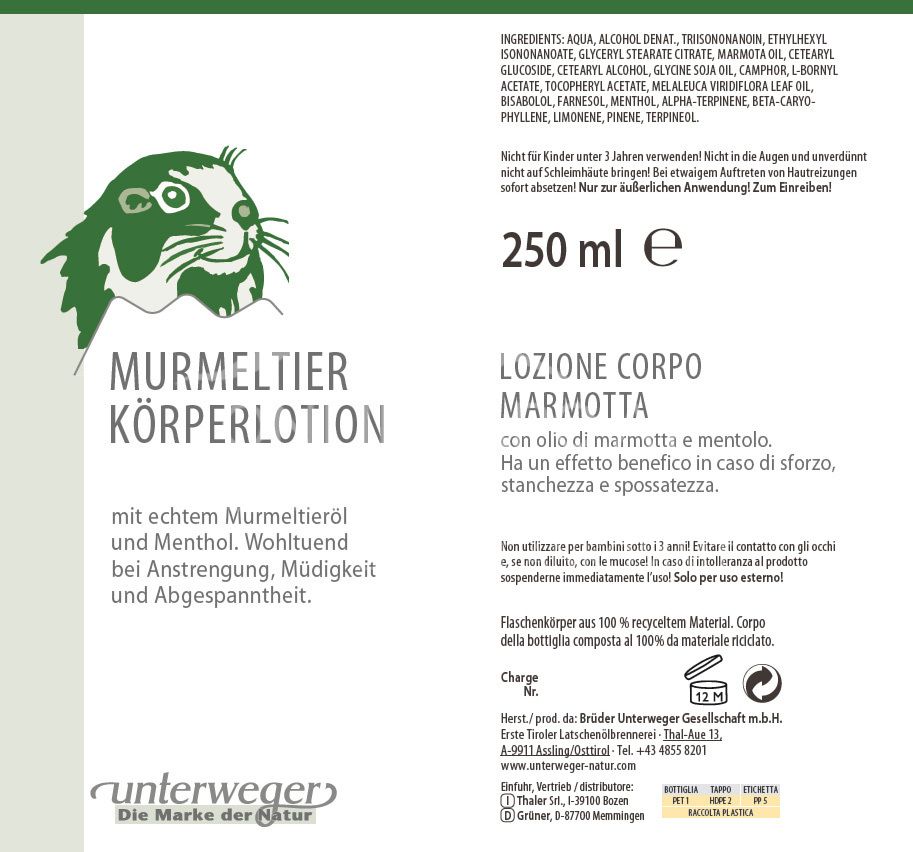Die Unterweger Murmeltier Körperlotion kombiniert bewährtes Murmeltieröl mit wertvollem Latschenkieferöl und Menthol. Diese Rezeptur pflegt die Haut nach körperlicher Belastung und fördert das Wohlbefinden.