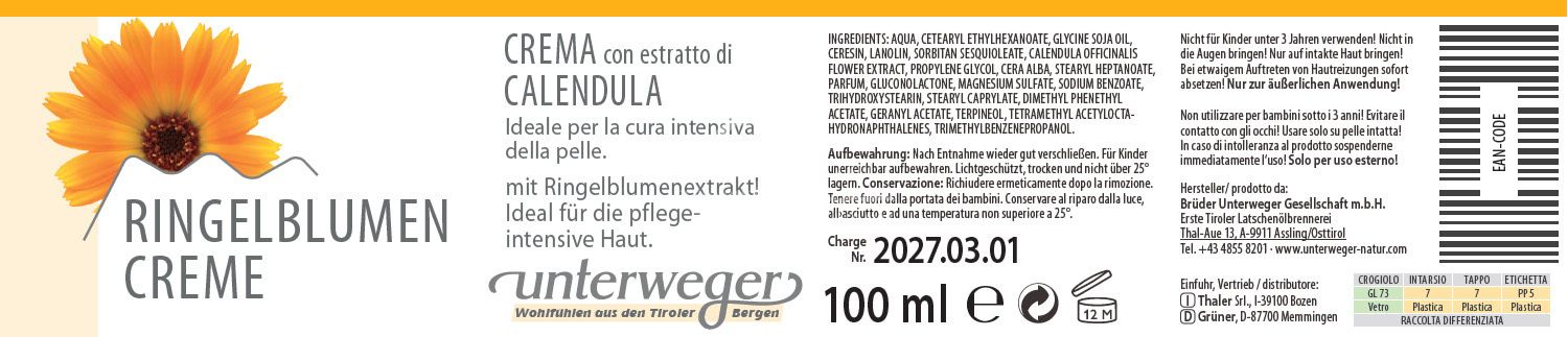 Die Unterweger Ringelblumen Creme unterstützt mit hochwertigem Bio-Extrakt die natürliche Regeneration beanspruchter Hautstellen. Sie bewahrt die Elastizität, macht die Haut spürbar geschmeidig und darf in keiner Hausapotheke fehlen.